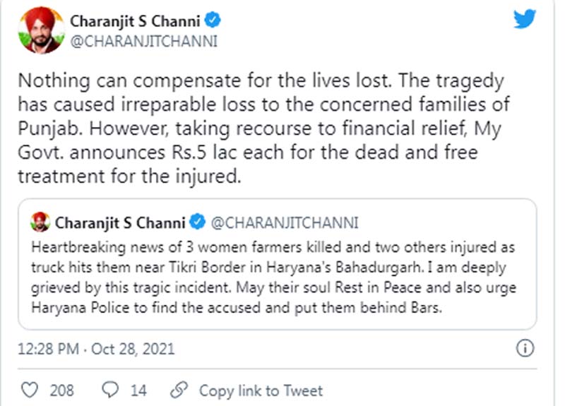 ਡੂੰਘੇ ਦੁੱਖ਼ ਦਾ ਪ੍ਰਗਟਾਵਾ ਕਰਦੇ ਚਰਨਜੀਤ ਸਿੰਘ ਚੰਨੀ ਨੇ ਕਿਹਾ ਕਿ ਹਰਿਆਣਾ ਦੇ ਬਹਾਦੁਰਗੜ੍ਹ ’ਚ ਟਿਕਰੀ ਬਾਰਡਰ ਨੇੜੇ ਟਰੱਕ ਦੀ ਟਕੱਰ ਨਾਲ 3 ਕਿਸਾਨ ਬੀਬੀਆਂ ਦੀ ਮੌਤ ਹੋਣ ਦੀ ਖ਼ਬਰ ਦਿਲ ਨੂੰ ਦਹਿਲਾ ਦੇਣ ਵਾਲੀ ਹੈ। ਇਸ ਦੁੱਖ਼ਦਾਇਕ ਘਟਨਾ ਨੂੰ ਸੁਣ ਕੇ ਬੇਹੱਦ ਦੁੱਖ਼ ਪਹੁੰਚਿਆ। ਮ੍ਰਿਤਕਾਂ ਦੀ ਆਤਮਾ ਨੂੰ ਸ਼ਾਂਤੀ ਮਿਲੇ।