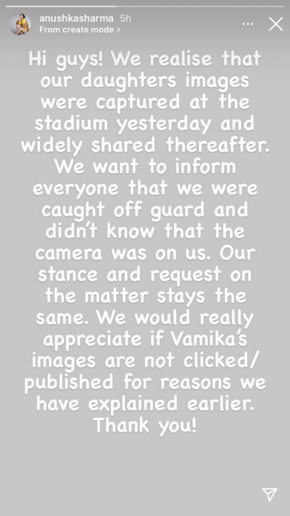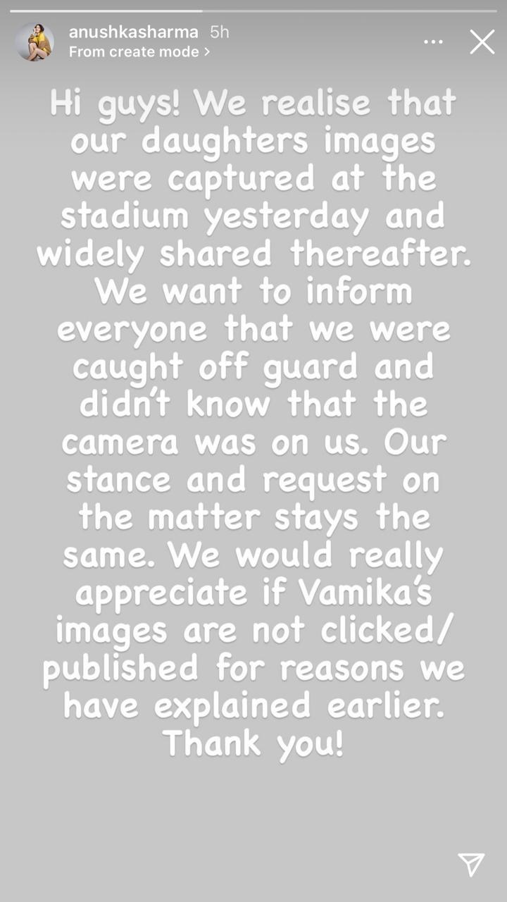 ਅਨੁਸ਼ਕਾ ਸ਼ਰਮਾ ਨੇ ਇਸ ਨਾਲ ਸਬੰਧਤ ਆਪਣੇ ਇੰਸਟਾਗ੍ਰਾਮ ਉੱਤੇ ਇੱਕ ਪੋਸਟ ਪਾਈ ਹੈ। ਅਨੁਸ਼ਕਾ ਸ਼ਰਮਾ ਨੇ ਇੰਸਟਾ ਪੋਸਟ 'ਚ ਲਿਖਿਆ, 'ਹੈਲੋ ਦੋਸਤੋ, ਸਾਨੂੰ ਅਹਿਸਾਸ ਹੋਇਆ ਕਿ ਸਾਡੀ ਬੇਟੀ ਦੀ ਤਸਵੀਰ ਪਿਛਲੇ ਦਿਨੀਂ ਸਟੇਡੀਅਮ 'ਚ ਕੈਪਚਰ ਕੀਤੀ ਗਈ ਸੀ ਅਤੇ ਹੁਣ ਇਸ ਨੂੰ ਇੰਟਰਨੈੱਟ 'ਤੇ ਤੇਜ਼ੀ ਨਾਲ ਸ਼ੇਅਰ ਕੀਤਾ ਜਾ ਰਿਹਾ ਹੈ। ਅਸੀਂ ਸਾਰਿਆਂ ਨੂੰ ਸੂਚਿਤ ਕਰਨਾ ਚਾਹੁੰਦੇ ਹਾਂ ਕਿ ਸਾਨੂੰ ਨਹੀਂ ਪਤਾ ਸੀ ਕਿ ਕੈਮਰਾ ਸਾਡੇ 'ਤੇ ਸੀ। ਸਾਡੀ ਅਪੀਲ ਹੈ ਕਿ ਇਸ ਨੂੰ ਇੱਥੇ ਹੀ ਰੋਕ ਦਿੱਤਾ ਜਾਵੇ। ਕ੍ਰਿਕਟਰ ਵਿਰਾਟ ਕੋਹਲੀ ਨੇ ਵੀ ਅਨੁਸ਼ਕਾ ਦੀ ਇਸ ਪੋਸਟ ਨੂੰ ਆਪਣੇ ਸੋਸ਼ਲ ਮੀਡੀਆ ਉੱਤੇ ਸ਼ੇਅਰ ਕੀਤਾ ਹੈ।