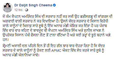 ਇਸਦੇ ਸੰਬੰਧ ਵਿੱਚ ਸ਼੍ਰੋਮਣੀ ਅਕਾਲੀ ਦਲ ਦੇ ਆਗੂ ਦਿਲਜੀਤ ਸਿੰਘ ਦੇ ਵਲੋਂ ਇਕ ਟਵੀਟ ਕੀਤਾ ਗਿਆ ਜਿਸ ਵਿੱਚ ਇਹਨਾਂ ਨੇ ਲਿਖਿਆ ਹੈ ਕਿ ਜੋ ਕੰਮ ਕੈਪਟਨ ਅਮਰਿੰਦਰ ਸਿੰਘ ਦੀ ਸਰਕਾਰ ਨਹੀਂ ਕਰ ਸਕੀ ਉਹ ਛਤੀਸਗੜ੍ਹ ਦੀ ਕਾਂਗਰਸ ਦੀ ਅਗਵਾਈ ਵਾਲੀ ਸਰਕਾਰ ਨੇ ਕਰ ਦਿਖਾਇਆ ਹੈ। ਉਸਨੇ ਕੇਂਦਰ ਸਰਕਾਰ ਦੇ ਕਿਸਾਨ ਵਿਰੋਧੀ ਕਾਲੇ ਕਾਨੂੰਨਾਂ ਦੇ ਖਿਲਾਫ਼ ਸਾਰੇ ਸੂਬੇ ਨੂੰ ਇੱਕ ਅਨਾਜ਼ ਮੰਡੀ ਘੋਸ਼ਿਤ ਕਰ ਦਿੱਤਾ ਹੈ ਪਰ ਪੰਜਾਬ ਵਿੱਚ ਵਾਰ ਵਾਰ ਕਹਿਣ ਦੇ ਬਾਵਜੂਦ ਵੀ ਕੈਪਟਨ ਅਮਰਿੰਦਰ ਸਿੰਘ ਅਤੇ ਸੁਨੀਲ ਜਾਖੜ ਨੇ ਉਪਰੋਕਤ ਕਿਸਾਨ ਪੱਖੀ ਫੈਸਲਾ ਲੈਣ ਤੋਂ ਟਾਲਾ ਵੱਟਿਆ ਹੈ ਅਤੇ ਕਈ ਤਰ੍ਹਾਂ ਦੇ ਝੂਠੇ ਬਹਾਨੇ ਘੜੇ ਹਨ।