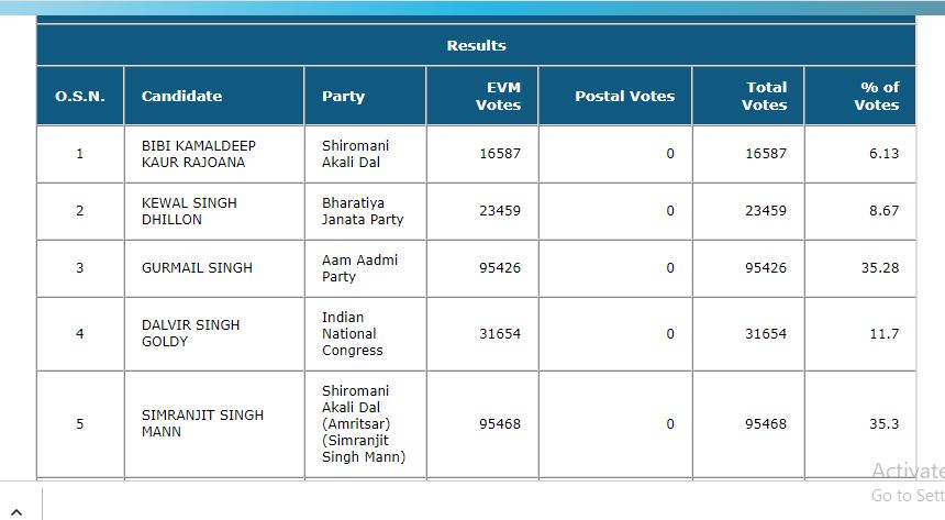 ਸਿਮਰਨਜੀਤ ਮਾਨ ਨੂੰ ਪਈਆਂ 1,00,173 ਵੋਟਾਂ ਨੂੰ ਪਈਆਂ ਹਨ। AAP ਦੇ ਗੁਰਮੇਲ ਸਿੰਘ ਨੂੰ 1,00,965 ਵੋਟਾਂ ਪਈਆਂ ਹਨ।ਦਲਵੀਰ ਗੋਲਡੀ ਨੂੰ 33,506 ਵੋਟਾਂ ਪਈਆਂ ਹਨ । BJP ਦੇ ਕੇਵਲ ਢਿੱਲੋਂ ਨੂੰ 26,197 ਵੋਟਾਂ ਪਈਆਂ ਹਨ। ਕਮਲਦੀਪ ਰਾਜੋਆਣਾ ਨੂੰ 17,890 ਵੋਟਾਂ ਪਈਆਂ ਹਨ।