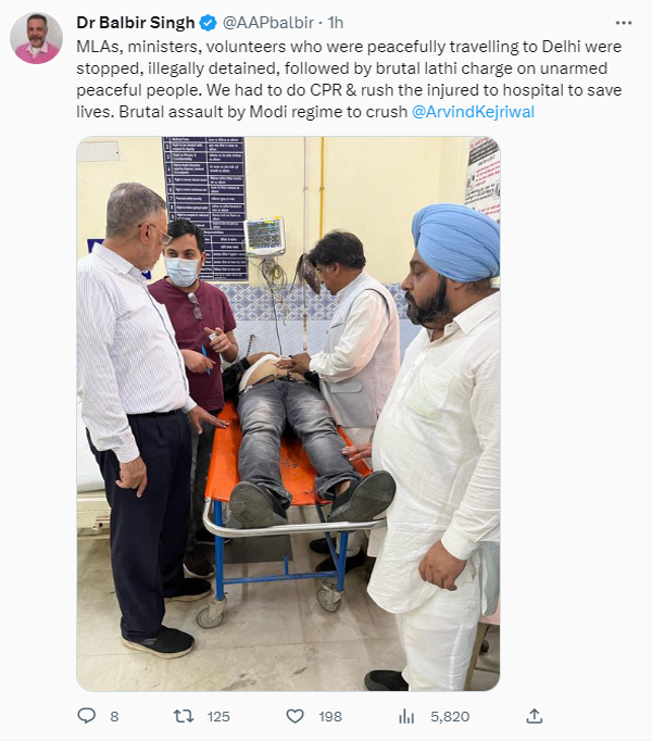 ਨਿਊਜ਼ ਡੈਸਕ (ਰਿੰਪੀ ਸ਼ਰਮਾ) : ਦਿੱਲੀ ਦੇ ਮੁੱਖ ਮੰਤਰੀ ਕੇਜਰੀਵਾਲ ਦੇ ਸਮਰਥਨ ਵਿੱਚ ਆਪ ਸਰਕਾਰ ਦੇ ਸਾਰੇ ਵਿਧਾਇਕ ਤੇ ਮੰਤਰੀ ਸਮੇਤ ਹੋਰ ਆਗੂ ਦਿੱਲੀ ਪਹੁੰਚੇ ਹਨ। ਕੈਬਨਿਟ ਮੰਤਰੀ ਬਲਬੀਰ ਸਿੰਘ ਨੇ ਦੋਸ਼ ਲਗਾਏ ਕਿ ਪੁਲਿਸ ਵਲੋਂ ਉਨ੍ਹਾਂ ਨਾਲ ਨਾਜਾਇਜ਼ ਧੱਕਾ ਕੀਤਾ ਜਾ ਰਿਹਾ ਹੈ । ਆਮ ਆਦਮੀ ਪਾਰਟੀ ਦੇ ਆਗੂ ਸ਼ਾਂਤੀਪੂਰਵਕ ਤਰੀਕੇ ਨਾਲ ਦਿੱਲੀ ਜਾ ਰਹੇ ਸੀ ਕਿ ਪੁਲਿਸ ਨੇ ਲਾਠੀਚਾਰਜ ਕਰਨਾ ਸ਼ੁਰੂ ਕਰ ਦਿੱਤਾ।