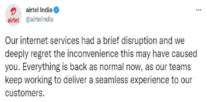 ਏਅਰਟੈੱਲ ਨੇ ਟਵੀਟ ਕਰਕੇ ਕਿਹਾ ਹੈ ਕਿ ਉਸਨੂੰ ਆਊਟੇਜ ਦੀ ਜਾਣਕਾਰੀ ਮਿਲੀ ਹੈ। ਕੰਪਨੀ ਨੇ ਕਿਹਾ, ‘ਸਾਡੀਆਂ ਇੰਟਰਨੈੱਟ ਸੇਵਾਵਾਂ ’ਚ ਕੁਝ ਦੇਰ ਲਈ ਸਮੱਸਿਆ ਆਈ ਹੈ ਅਤੇ ਇਸ ਨਾਲ ਤੁਹਾਨੂੰ ਹੋਈ ਅਸੁਵਿਧਾ ਲਈ ਸਾਨੂੰ ਅਫਸੋਸ ਹੈ। ਹੁਣ ਸਭ ਕੁਝ ਠੀਕ ਹੋ ਗਿਆ ਹੈ ਕਿਉਂਕਿ ਸਾਡੀਆਂ ਟੀਮਾਂ ਸਾਡੇ ਗਾਹਕਾਂ ਨੂੰ ਇਕ ਸ਼ਾਨਦਾਰ ਅਨੁਭਵ ਦੇਣ ਲਈ ਲਗਾਤਾਰ ਕੰਮ ਕਰਦੀਆਂ ਹਨ।’