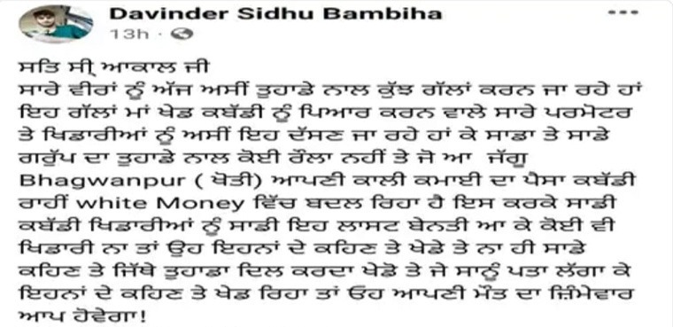 ਨਿਊਜ਼ ਡੈਸਕ (ਰਿੰਪੀ ਸ਼ਰਮਾ) : ਗੈਂਗਸਟਰ ਜੱਗੂ, ਲਾਰੈਂਸ ਤੇ ਗੋਲਡੀ ਬਰਾੜ ਕੋਲੋਂ ਬਦਲਾ ਲੈਣ ਦੀ ਧਮਕੀਆਂ ਦੇਣ ਵਾਲਾ ਬੰਬੀਹਾ ਗੈਂਗ ਹੁਣ ਪੰਜਾਬ ਦੇ ਕਬੱਡੀ ਖਿਡਾਰੀਆਂ ਨੂੰ ਧਮਕੀਆਂ ਦੇ ਰਹੇ ਹਨ। ਬੰਬੀਹਾ ਗੈਂਗ ਨੇ ਪੋਸਟ ਪਾ ਕੇ ਕਿਹਾ ਕਿ ਅਸੀਂ ਕਬੱਡੀ ਖਿਡਾਰੀਆਂ ਤੇ ਪ੍ਰਮੋਟਰਾਂ ਨੂੰ ਬੇਨਤੀ ਕਰਦੇ ਹਾਂ ਕਿ ਉਹ ਜੱਗੂ ਭਗਵਾਨਪੁਰੀਆਂ ਦੇ ਬੋਲਣ ਤੇ ਕਬੱਡੀ ਮੈਚ ਨਾ ਖੇਡਣ ਤੇ ਨਾ ਹੀ ਕੋਈ ਆਯੋਜਿਤ ਕਰਨ ।