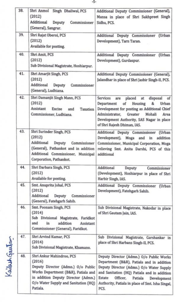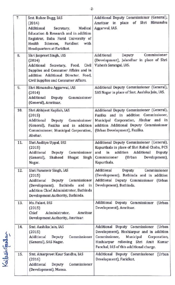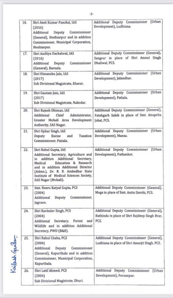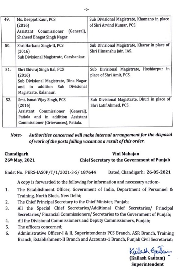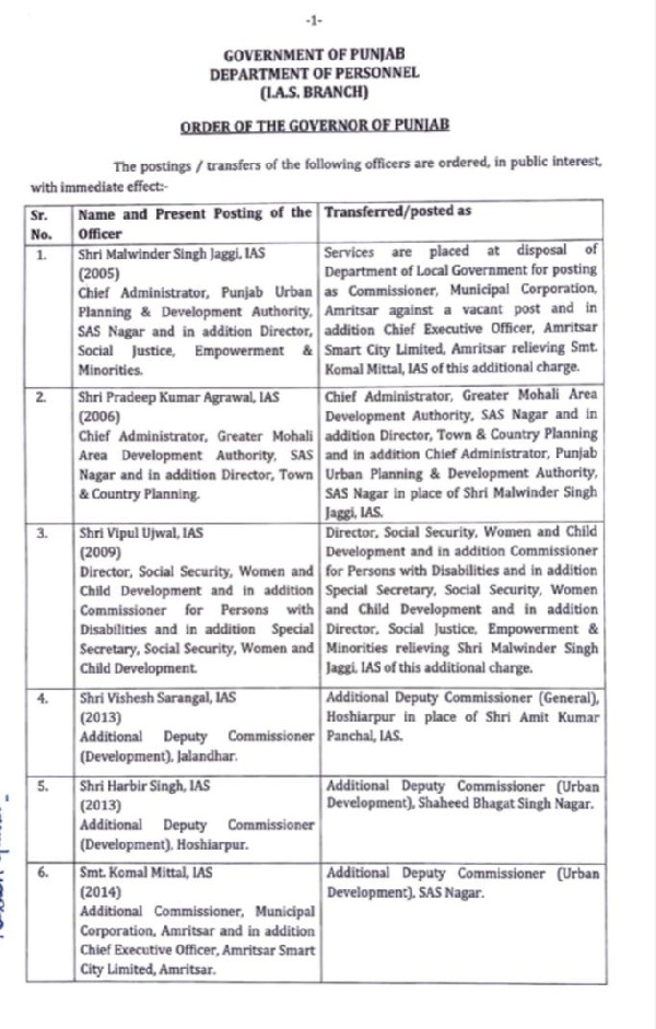 ਚੰਡੀਗੜ੍ਹ (ਦੇਵ ਇੰਦਰਜੀਤ) : ਦੱਸ ਦੇਈਏ ਕਿ ਅਗਲੇ ਸਾਲ ਪੰਜਾਬ 'ਚ ਵਿਧਾਨ ਸਭਾ ਚੋਣਾਂ ਹਨ। ਇਸ ਦੇ ਮੱਦੇਨਜ਼ਰ ਮੁੱਖ ਮੰਤਰੀ ਕੈਪਟਨ ਅਮਰਿੰਦਰ ਸਿੰਘ ਵਲੋਂ ਪੰਜਾਬ 'ਚ ਇਹ ਵੱਡਾ ਫੇਰ ਬਦਲ ਕੀਤਾ ਗਿਆ ਹੈ। ਪੰਜਾਬ ਸਰਕਾਰ ਵਲੋਂ ਬੁੱਧਵਾਰ ਦੇਰ ਰਾਤ 52 ਆਈ.ਏ.ਐੱਸ. ਅਧਿਕਰੀਆਂ ਦਾ ਤਬਾਦਲਾ ਕੀਤਾ ਗਿਆ ਹੈ। ਵਿਧਾਨ ਸਭਾ ਚੋਣਾਂ ਤੋਂ ਪਹਿਲਾਂ ਇਹ ਸਭ ਤੋਂ ਵੱਡਾ ਫੇਰਬਦਲ ਮੰਨਿਆ ਜਾ ਰਿਹਾ ਹੈ। ਮੁੱਖ ਮੰਤਰੀ ਕੈਪਟਨ ਅਮਰਿੰਦਰ ਸਿੰਘ ਵੱਲ਼ੋਂ 2005 ਬੈਚ ਦੇ ਆਈ.ਏ.ਐੱਸ. ਅਧਿਕਾਰੀ ਮਲਵਿੰਦਰ ਸਿੰਘ ਜੱਗੀ ਨੂੰ ਅੰਮ੍ਰਿਤਸਰ ਨਗਰ ਨਿਗਮ ਦਾ ਕਮਿਸ਼ਨਰ ਥਾਪਿਆ ਗਿਆ ਹੈ। 2017 ਬੈਚ ਦੇ ਅਧਿਕਾਰੀ ਹਿਮਾਂਸ਼ੂ ਜੈਨ ਨੂੰ ਜਲੰਧਰ 'ਚ ਵਧੀਕ ਡਿਪਟੀ ਕਮਿਸ਼ਨਰ ਬਣਾਇਆ ਗਿਆ ਹੈ।