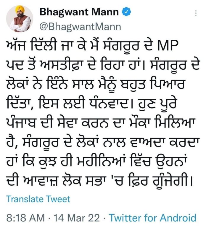 ਨਿਊਜ਼ ਡੈਸਕ : ਪੰਜਾਬ ਦੇ ਨਵੇਂ ਬਣਨ ਵਾਲੇ ਮੁੱਖ ਮੰਤਰੀ ਭਗਵੰਤ ਮਾਨ ਅੱਜ ਸੰਗਰੂਰ ਲੋਕ ਸਭਾ ਸੀਟ ਤੋਂ ਅਸਤੀਫ਼ਾ ਦੇਣ ਜਾ ਰਹੇ ਹਨ। ਇਸ ਬਾਰੇ ਟਵੀਟ ਕਰਦਿਆਂ ਭਗਵੰਤ ਮਾਨ ਨੇ ਕਿਹਾ ਹੈ ਕਿ ਉਹ ਅੱਜ ਦਿੱਲੀ ਜਾ ਕੇ ਸੰਗਰੂਰ ਦੇ ਸੰਸਦ ਮੈਂਬਰ ਦੇ ਅਹੁਦੇ ਤੋਂ ਅਸਤੀਫ਼ਾ ਦੇ ਰਹੇ ਹਨ। ਉਨ੍ਹਾਂ ਕਿਹਾ ਕਿ ਸੰਗਰੂਰ ਦੇ ਲੋਕਾਂ ਨੇ ਇੰਨੇ ਸਾਲ ਉਨ੍ਹਾਂ ਨੂੰ ਬਹੁਤ ਪਿਆਰ ਦਿੱਤਾ ਹੈ, ਇਸ ਦੇ ਲਈ ਧੰਨਵਾਦ। ਭਗਵੰਤ ਮਾਨ ਨੇ ਕਿਹਾ ਕਿ ਹੁਣ ਉਨ੍ਹਾਂ ਨੂੰ ਪੂਰੇ ਪੰਜਾਬ ਦੀ ਸੇਵਾ ਕਰਨ ਦਾ ਮੌਕਾ ਮਿਲਿਆ ਹੈ ਅਤੇ ਉਹ ਸੰਗਰੂਰ ਦੇ ਲੋਕਾਂ ਨਾਲ ਵਾਅਦਾ ਕਰਦੇ ਹਨ ਕਿ ਕੁੱਝ ਹੀ ਮਹੀਨਿਆਂ ‘ਚ ਉਨ੍ਹਾਂ ਦੀ ਆਵਾਜ਼ ਲੋਕ ਸਭਾ ‘ਚ ਫਿਰ ਗੂੰਜੇਗੀ।