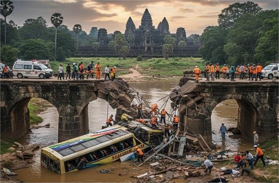 ਕੰਬੋਡੀਆ (ਪਾਇਲ): ਕੰਬੋਡੀਆ 'ਚ ਇਕ ਯਾਤਰੀ ਬੱਸ ਪੁਲ ਤੋਂ ਨਦੀ 'ਚ ਡਿੱਗ ਗਈ। ਇਸ ਹਾਦਸੇ 'ਚ ਘੱਟੋ-ਘੱਟ 16 ਲੋਕਾਂ ਦੀ ਮੌਤ ਹੋ ਗਈ ਅਤੇ ਦੋ ਦਰਜਨ ਤੋਂ ਵੱਧ ਜ਼ਖਮੀ ਹੋ ਗਏ। ਪੁਲਿਸ ਅਧਿਕਾਰੀ ਸਿਵ ਸੋਵੰਨਾ ਨੇ ਐਸੋਸੀਏਟਡ ਪ੍ਰੈਸ ਨੂੰ ਫ਼ੋਨ ਰਾਹੀਂ ਦੱਸਿਆ ਕਿ ਬੱਸ ਸਿਏਮ ਰੀਪ ਤੋਂ ਫਨੋਮ ਪੇਨ ਵੱਲ ਜਾ ਰਹੀ ਸੀ, ਜਿੱਥੇ ਮਸ਼ਹੂਰ ਅੰਗਕੋਰ ਵਾਟ ਮੰਦਿਰ ਸਥਿਤ ਹੈ। ਇਹ ਹਾਦਸਾ ਵੀਰਵਾਰ ਸਵੇਰੇ ਕੇਂਦਰੀ ਸੂਬੇ ਦੇ ਕੰਪੋਂਗ ਥੌਮ ਵਿੱਚ ਵਾਪਰਿਆ।