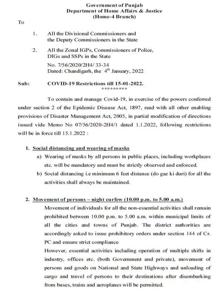 ਪੰਜਾਬ ਸਰਕਾਰ ਨੇ ਕੋਰੋਨਨਾ ਦੇ ਵੱਧ ਰਹੇ ਕੇਸਾਂ ਦੇ ਮੱਧੇਨਜ਼ਰ ਵੱਡਾ ਫੈਸਲਾ ਲਿਆ ਹੈ। ਸਰਕਾਰ ਨੇ ਸੂਬੇ ਵਿਚ ਸਕੂਲਾਂ ਤੇ ਕਾਲਜਾਂ ਨੂੰ ਬੰਦ ਕਰਨ ਦਾ ਫੈਸਲਾ ਲਿਆ ਹੈ। ਸੂਬੇ 'ਚ ਰਾਤ 10 ਵਜੇ ਤੋਂ ਸਵੇਰੇ 5 ਵਜੇ ਤਕ ਨ੍ਹਾਈਟ ਕਰਫਿਊ ਲਗਾ ਦਿੱਤਾ ਗਿਆ ਹੈ। ਇਸ ਤੋਂ ਪਹਿਲਾਂ ਸੋਮਵਾਰ ਨੂੰ ਪਠਾਨਕੋਟ ਦੇ ਡੀਸੀ ਨੇ ਮੰਗਲਵਾਰ ਤੋਂ ਪਠਾਨਕੋਟ 'ਚ ਚੌਥੀ ਜਮਾਤ ਤਕ ਦੇ ਸਾਰੇ ਨਿੱਦੀ ਤੇ ਸਰਕਾਰੀ ਸਕੂਲ ਤੇ ਆਂਗਣਵਾੜੀ ਕੇਂਦਰ 14 ਜਨਵਰੀ ਤਕ ਬੰਦ ਕਰਨ ਦੇ ਹੁਕਮ ਜਾਰੀ ਕੀਤੇ ਸਨ, ਜੋ ਅੱਜ ਤੋਂ ਲਾਗੂ ਹੋ ਗਏ ਹਨ।