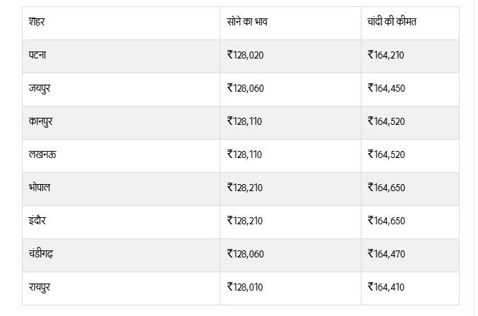 ਸਵੇਰੇ 9:33 ਵਜੇ, MCX 'ਤੇ 1 ਕਿਲੋ ਚਾਂਦੀ ਦੀ ਕੀਮਤ ₹163,920 ਹੈ, ਜੋ ਕਿ ਪ੍ਰਤੀ ਕਿਲੋ ₹1,714 ਦਾ ਵਾਧਾ ਹੈ। ਚਾਂਦੀ ਹੁਣ ਤੱਕ ₹163,032 ਪ੍ਰਤੀ ਕਿਲੋਗ੍ਰਾਮ ਦੇ ਹੇਠਲੇ ਪੱਧਰ ਅਤੇ ₹164,150 ਪ੍ਰਤੀ ਕਿਲੋਗ੍ਰਾਮ ਦੇ ਉੱਚ ਪੱਧਰ 'ਤੇ ਪਹੁੰਚ ਗਈ ਹੈ। ਅੱਜ, ਰਾਏਪੁਰ ਵਿੱਚ ਸੋਨਾ ਸਭ ਤੋਂ ਸਸਤਾ ਹੈ, ਜਿੱਥੇ 10 ਗ੍ਰਾਮ ਦੀ ਕੀਮਤ ₹128,010 ਹੈ। ਸਭ ਤੋਂ ਮਹਿੰਗਾ ਸੋਨਾ ਭੋਪਾਲ ਅਤੇ ਇੰਦੌਰ ਵਿੱਚ ਹੈ, ਜਿੱਥੇ ਕੀਮਤ ₹128,210 ਪ੍ਰਤੀ 10 ਗ੍ਰਾਮ ਹੈ। ਇਸ ਤੋਂ ਇਲਾਵਾ, ਜਦੋਂ ਚਾਂਦੀ ਦੀ ਗੱਲ ਆਉਂਦੀ ਹੈ, ਤਾਂ ਪਟਨਾ ਵਿੱਚ ਸਭ ਤੋਂ ਘੱਟ ਕੀਮਤ ਹੈ, ਇੱਥੇ 1 ਕਿਲੋਗ੍ਰਾਮ ਚਾਂਦੀ ₹164,210 ਵਿੱਚ ਉਪਲਬਧ ਹੈ। ਭੋਪਾਲ ਅਤੇ ਇੰਦੌਰ ਸਭ ਤੋਂ ਮਹਿੰਗੇ ਹਨ, ਜਿੱਥੇ 1 ਕਿਲੋਗ੍ਰਾਮ ਚਾਂਦੀ ਦੀ ਕੀਮਤ ₹164,650 ਹੈ।