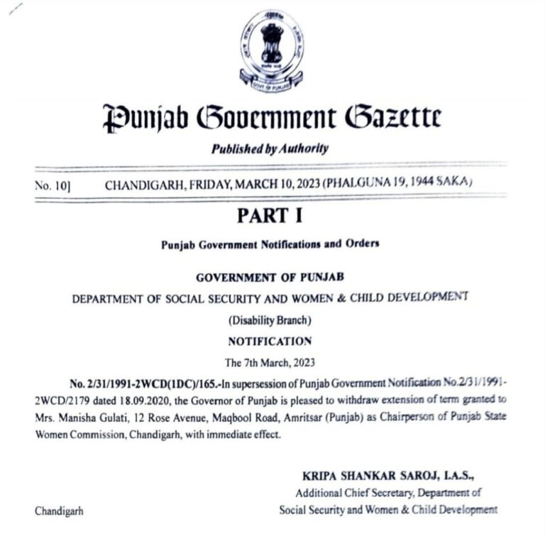 ਨਿਊਜ਼ ਡੈਸਕ (ਰਿੰਪੀ ਸ਼ਰਮਾ) : ਪੰਜਾਬ ਸਰਕਾਰ ਵਲੋਂ ਮਹਿਲਾ ਕਮਿਸ਼ਨ ਦੇ ਚੇਅਰਪਰਸਨ ਅਹੁਦੇ ਤੋਂ ਮਨੀਸ਼ਾ ਗੁਲਾਟੀ ਨੂੰ ਹਟਾ ਦਿੱਤਾ ਗਿਆ ਹੈ। ਦੱਸਿਆ ਜਾ ਰਿਹਾ ਮਾਨ ਸਰਕਾਰ ਨੇ ਉਨ੍ਹਾਂ ਨੂੰ ਦਿੱਤੀ ਐਕਸਟੈਸ਼ਨ ਵਾਪਸ ਲੈ ਲਈ । ਮਨੀਸ਼ਾ ਗੁਲਾਟੀ ਨੂੰ ਅਹੁਦੇ ਤੋਂ ਹਟਾਉਣ ਲਈ ਪੰਜਾਬ ਸਰਕਾਰ ਨੇ ਕਾਂਗਰਸ ਸਰਕਾਰ ਵਲੋਂ ਮਿਆਦ 'ਚ ਕੀਤੇ ਵਾਧੇ ਦੇ ਹੁਕਮ ਵਾਪਸ ਲੈ ਲਏ ਹਨ ।
