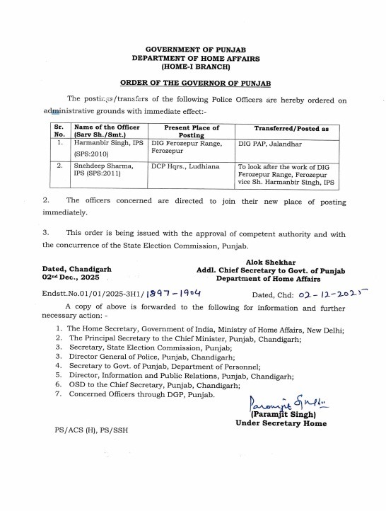 ਇਸਦੀ ਇੱਕ ਹੋਰ ਨਵੀਂ ਉਦਾਹਰਣ ਉਦੋਂ ਦੇਖਣ ਨੂੰ ਮਿਲੀ ਜਦੋਂ ਗ੍ਰਹਿ ਵਿਭਾਗ ਨੇ ਮੰਗਲਵਾਰ ਨੂੰ ਡੀਆਈਜੀ ਫਿਰੋਜ਼ਪੁਰ ਰੇਂਜ ਹਰਮਨਬੀਰ ਸਿੰਘ ਗਿੱਲ ਦਾ ਤਬਾਦਲਾ ਕਰਕੇ ਪੀਏਪੀ ਜਲੰਧਰ ਭੇਜ ਦਿੱਤਾ। ਗ੍ਰਹਿ ਵਿਭਾਗ ਵੱਲੋਂ ਜਾਰੀ ਹੁਕਮਾਂ ਵਿੱਚ ਸਪੱਸ਼ਟ ਤੌਰ 'ਤੇ ਲਿਖਿਆ ਹੈ ਕਿ ਹਰਮਨਬੀਰ ਸਿੰਘ ਗਿੱਲ ਦੀ ਥਾਂ 'ਤੇ ਹੁਣ ਫਿਰੋਜ਼ਪੁਰ ਰੇਂਜ ਦਾ ਸਾਰਾ ਕੰਮ ਡੀਸੀਪੀ ਲੁਧਿਆਣਾ (ਸਥਾਨਕ) ਸਨੇਹਦੀਪ ਸ਼ਰਮਾ ਆਈਪੀਐਸ ਨੂੰ ਦਿੱਤਾ ਗਿਆ ਹੈ।
