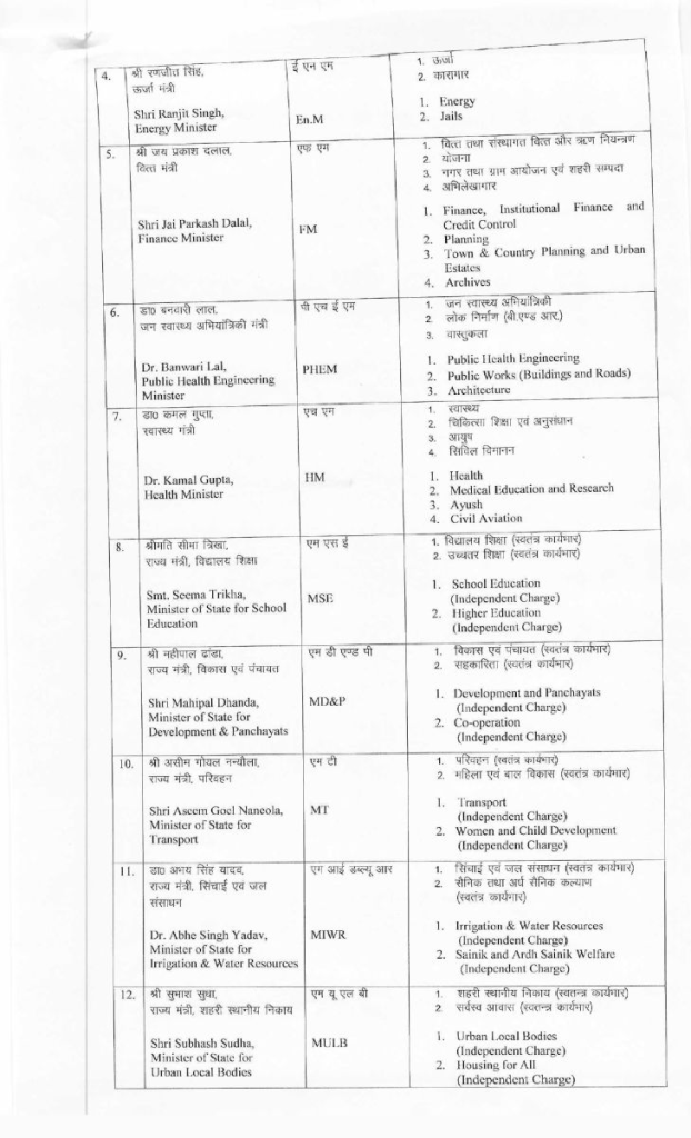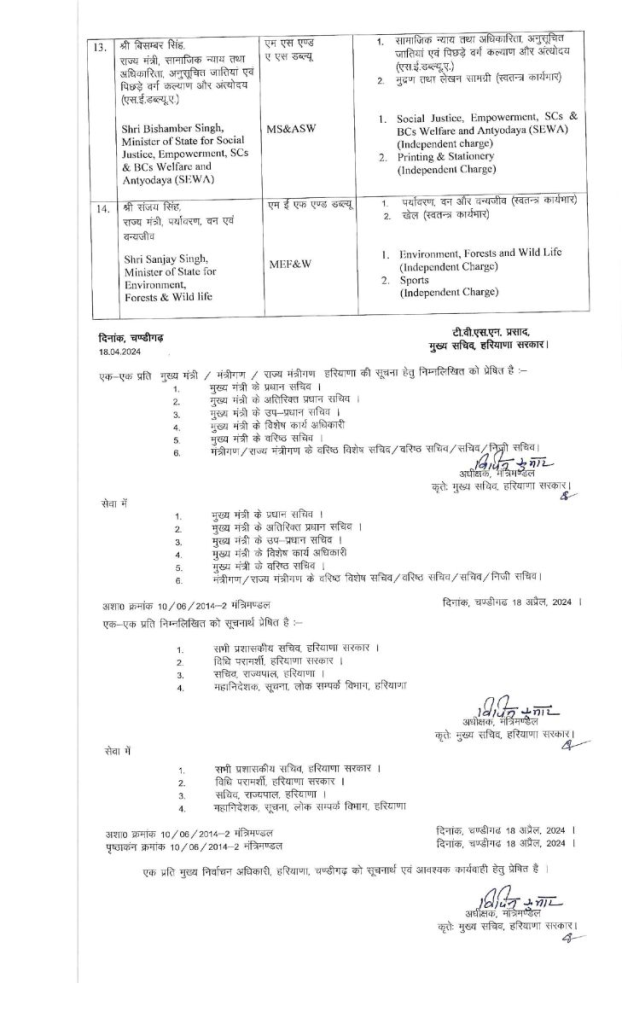 ਹਰਿਆਣਾ ਦੀ ਭਾਜਪਾ ਸਰਕਾਰ ਨੇ ਨਵੇਂ ਮੁੱਖ ਮੰਤਰੀ ਨਾਇਬ ਸੈਣੀ ਅਤੇ ਮੰਤਰੀ ਮੰਡਲ ਦੇ ਸਹੁੰ ਚੁੱਕਣ ਤੋਂ ਡੇਢ ਮਹੀਨੇ ਬਾਅਦ ਮੁੱਖ ਮੰਤਰੀ ਸਮੇਤ 14 ਮੰਤਰੀਆਂ ਨੂੰ ਵਿਭਾਗ ਵੰਡ ਦਿੱਤੇ ਹਨ। ਸੀਐਮ ਨਾਇਬ ਸੈਣੀ ਨੇ ਗ੍ਰਹਿ ਵਿਭਾਗ ਆਪਣੇ ਕੋਲ ਰੱਖਿਆ ਹੈ। ਜੇਪੀ ਦਲਾਲ ਨੂੰ ਸੂਬੇ ਦਾ ਨਵਾਂ ਵਿੱਤ ਮੰਤਰੀ ਬਣਾਇਆ ਗਿਆ ਹੈ। ਸਿਹਤ ਵਿਭਾਗ ਦੀ ਦੇਖ-ਰੇਖ ਡਾ: ਕਮਲ ਗੁਪਤਾ ਕਰਨਗੇ। ਪਹਿਲਾਂ ਗ੍ਰਹਿ ਵਿਭਾਗ ਅਤੇ ਸਿਹਤ ਵਿਭਾਗ ਅਨਿਲ ਵਿੱਜ ਕੋਲ ਸੀ। ਹਾਲਾਂਕਿ ਇਸ ਵਾਰ ਉਹ ਮੰਤਰੀ ਨਹੀਂ ਬਣੇ। ਵੱਧ ਤੋਂ ਵੱਧ 14 ਵਿਭਾਗ ਮੁੱਖ ਮੰਤਰੀ ਨਾਇਬ ਸੈਣੀ ਕੋਲ ਹਨ।