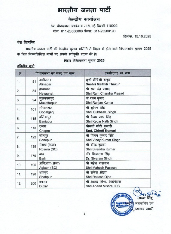 ਪਟਨਾ (ਪਾਇਲ): ਭਾਰਤੀ ਜਨਤਾ ਪਾਰਟੀ ਨੇ ਬਿਹਾਰ ਵਿਧਾਨ ਸਭਾ ਚੋਣਾਂ 2025 ਨੂੰ ਲੈ ਕੇ ਉਮੀਦਵਾਰਾਂ ਦੀ ਦੂਜੀ ਸੂਚੀ (ਭਾਜਪਾ ਉਮੀਦਵਾਰ ਦੂਜੀ ਸੂਚੀ 2025) ਜਾਰੀ ਕਰ ਦਿੱਤੀ ਹੈ। ਦੂਜੀ ਸੂਚੀ ਵਿੱਚ 12 ਉਮੀਦਵਾਰਾਂ ਦੇ ਨਾਂ ਹਨ। ਭਾਜਪਾ ਨੇ ਇੱਕ ਦਿਨ ਪਹਿਲਾਂ ਭਾਜਪਾ ਵਿੱਚ ਸ਼ਾਮਲ ਹੋਈ ਮੈਥਿਲੀ ਠਾਕੁਰ ਨੂੰ ਅਲੀਨਗਰ ਵਿਧਾਨ ਸਭਾ ਸੀਟ ਤੋਂ ਟਿਕਟ ਦਿੱਤੀ ਹੈ।
