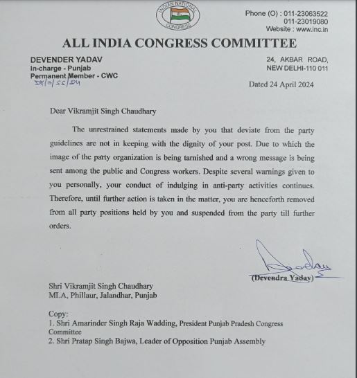 ਵਿਕਰਮਜੀਤ ਚੌਧਰੀ ਨੇ ਕਿਹਾ ਕਿ ਉਨ੍ਹਾਂ ਨੂੰ ਨਿੱਜੀ ਤੌਰ 'ਤੇ ਕਈ ਵਾਰ ਚੇਤਾਵਨੀਆਂ ਦੇਣ ਦੇ ਬਾਵਜੂਦ ਪਾਰਟੀ ਵਿਰੋਧੀ ਗਤੀਵਿਧੀਆਂ 'ਚ ਸ਼ਾਮਲ ਹੋਣ ਦਾ ਤੁਹਾਡਾ ਵਤੀਰਾ ਜਾਰੀ ਹੈ। ਇਸ ਲਈ ਮਾਮਲੇ ਵਿੱਚ ਅਗਲੀ ਕਾਰਵਾਈ ਹੋਣ ਤੱਕ ਵਿਕਰਮਜੀਤ ਚੌਧਰੀ ਨੂੰ ਪਾਰਟੀ ਦੇ ਅਹੁਦਿਆਂ ਤੋਂ ਹਟਾ ਕੇ ਅਗਲੇ ਹੁਕਮਾਂ ਤੱਕ ਪਾਰਟੀ ਵਿੱਚੋਂ ਮੁਅੱਤਲ ਕਰ ਦਿੱਤਾ ਗਿਆ ਹੈ।
