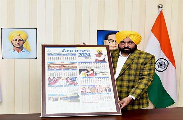 ਪੱਤਰ ਪ੍ਰੇਰਕ : ਪੰਜਾਬ ਦੇ ਮੁੱਖ ਮੰਤਰੀ ਭਗਵੰਤ ਸਿੰਘ ਮਾਨ ਨੇ ਸੋਮਵਾਰ ਸਵੇਰੇ ਆਪਣੇ ਨਿਵਾਸ ਸਥਾਨ 'ਤੇ ਸਾਲ 2024 ਲਈ ਪੰਜਾਬ ਸਰਕਾਰ ਦੀ ਡਾਇਰੀ ਅਤੇ ਕੈਲੰਡਰ ਜਾਰੀ ਕੀਤਾ ਹੈ। ਅੱਜ ਇੱਥੇ ਇਹ ਜਾਣਕਾਰੀ ਦਿੰਦਿਆਂ ਮੁੱਖ ਮੰਤਰੀ ਦਫ਼ਤਰ ਦੇ ਇਕ ਬੁਲਾਰੇ ਨੇ ਦੱਸਿਆ ਕਿ ਕੈਲੰਡਰ ਅਤੇ ਡਾਇਰੀ ਦਾ ਖਾਕਾ ਸੂਚਨਾ ਅਤੇ ਲੋਕ ਸੰਪਰਕ ਵਿਭਾਗ ਵੱਲੋਂ ਤਿਆਰ ਕੀਤਾ ਗਿਆ ਹੈ ਅਤੇ ਇਸ ਨੂੰ ਕੰਟਰੋਲਰ ਪ੍ਰਿੰਟਿੰਗ ਐਂਡ ਸਟੇਸ਼ਨਰੀ ਪੰਜਾਬ ਵੱਲੋਂ ਛਾਪਿਆ ਗਿਆ ਹੈ।