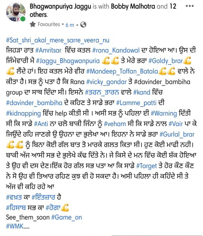 ਗੈਂਗਸਟਰ ਰਾਣਾ ਕੰਦੋਵਾਲੀਆ ਦੇ ਕਤਲ ਦੀ ਜ਼ਿੰਮੇਵਾਰੀ ਜੱਗੂ ਭਗਵਾਨਪੁਰੀਆ ਨੇ ਲਈ