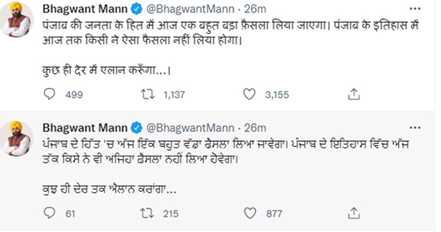 ਨਿਊਜ਼ ਡੈਸਕ : ਪੰਜਾਬ ਦੇ ਨਵੇਂ ਬਣੇ ਮੁੱਖ ਮੰਤਰੀ ਭਗਵੰਤ ਮਾਨ ਪੰਜਾਬ ਦੀ ਜਨਤਾ ਨੂੰ ਅੱਜ ਵੱਡਾ ਤੋਹਫ਼ਾ ਦੇਣ ਜਾ ਰਹੇ ਹਨ। ਇਸ ਦੀ ਜਾਣਕਾਰੀ ਮੁੱਖ ਮੰਤਰੀ ਭਗਵੰਤ ਮਾਨ ਨੇ ਖ਼ੁਦ ਟਵੀਟ ਕਰਕੇ ਦਿੱਤੀ ਹੈ। ਟਵੀਟ ਕਰਦੇ ਹੋਏ ਭਗਵੰਤ ਮਾਨ ਨੇ ਕਿਹਾ ਕਿ ਪੰਜਾਬ ਦੇ ਹਿੱਤ ’ਚ ਅੱਜ ਇਕ ਬਹੁਤ ਵੱਡਾ ਫ਼ੈਸਲਾ ਲਿਆ ਜਾਵੇਗਾ। ਪੰਜਾਬ ਦੇ ਇਤਿਹਾਸ ’ਚ ਅੱਜ ਤੱਕ ਕਿਸੇ ਨੇ ਵੀ ਅਜਿਹਾ ਫ਼ੈਸਲਾ ਨਹੀਂ ਲਿਆ ਹੋਵੇਗਾ। ਕੁਝ ਹੀ ਦੇਰ ’ਚ ਭਗਵੰਤ ਮਾਨ ਐਲਾਨ ਕਰਨਗੇ।