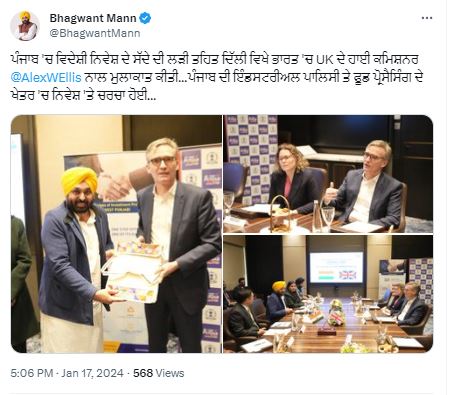 ਪੰਜਾਬ ਵਿੱਚ ਵਿਦੇਸ਼ੀ ਨਿਵੇਸ਼ ਦੇ ਸੱਦਿਆਂ ਦੀ ਲੜੀ ਦੇ ਹਿੱਸੇ ਵਜੋਂ, ਭਗਵੰਤ ਮਾਨ ਨੇ ਦਿੱਲੀ ਵਿੱਚ ਭਾਰਤ ਵਿੱਚ ਯੂਕੇ ਦੇ ਨਿਵੇਸ਼ਕਾਂ ਨਾਲ ਮੁਲਾਕਾਤ ਕੀਤੀ। ਇਸ ਦੌਰਾਨ ਸੀ.ਐਮ ਮਾਨ ਅਤੇ ਐਲੇਕਸ ਐਲਿਸ ਨੇ ਪੰਜਾਬ ਦੀ ਉਦਯੋਗਿਕ ਨੀਤੀ ਅਤੇ ਫੂਡ ਪ੍ਰੋਸੈਸਿੰਗ ਖੇਤਰ ਵਿੱਚ ਨਿਵੇਸ਼ ਬਾਰੇ ਚਰਚਾ ਕੀਤੀ।
