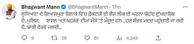 ਨਿਊਜ਼ ਡੈਸਕ (ਰਿੰਪੀ ਸ਼ਰਮਾ) : ਅੱਜ ਸਵੇਰੇ ਲੁਧਿਆਣਾ ਤੋਂ ਮੰਦਭਾਗੀ ਖ਼ਬਰ ਸਾਹਮਣੇ ਆਈ ਹੈ। ਜਿੱਥੇ ਗੈਸ ਲੋਕ ਹੋਣ ਕਾਰਨ 10 ਤੋਂ ਵੱਧ ਲੋਕਾਂ ਦੀ ਮੌਤ ਹੋ ਗਈ, ਜਦਕਿ ਕਈ ਲੋਕ ਬੇਹੋਸ਼ ਹੋ ਗਏ। ਇਸ ਮਾਮਲੇ ਨੂੰ ਲੈ ਕੇ CM ਭਗਵੰਤ ਮਾਨ ਨੇ ਟਵੀਟ ਕਰਦੇ ਦੁੱਖ ਦਾ ਪ੍ਰਗਟਾਵਾ ਕੀਤਾ । CM ਮਾਨ ਨੇ ਕਿਹਾ ਲੁਧਿਆਣਾ ਦੇ ਗਿਆਸਪੁਰ ਇਲਾਕੇ 'ਚ ਗੈਸ ਲੀਕ ਦੀ ਘਟਨਾ ਬਹੁਤ ਦੁੱਖਦਾਇਕ ਹੈ।