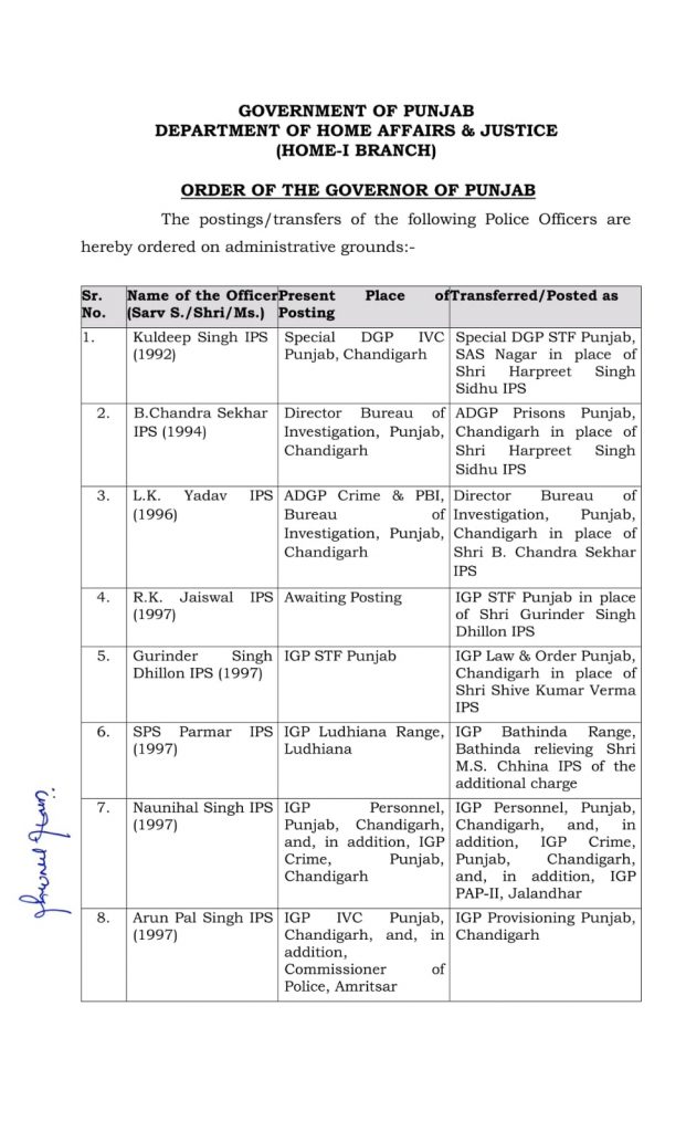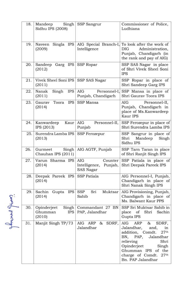 ਨਿਊਜ਼ ਡੈਸਕ (ਰਿੰਪੀ ਸ਼ਰਮਾ) : ਪੰਜਾਬ ਸਰਕਾਰ ਵਲੋਂ ਪੁਲਿਸ ਵਿਭਾਗ 'ਚ ਵੱਡਾ ਫੇਰਬਦਲ ਕੀਤਾ ਗਿਆ ਹੈ। ਪੰਜਾਬ ਸਰਕਾਰ ਵਲੋਂ 30 IPS ਸਮੇਤ 33 ਪੁਲਿਸ ਅਧਿਕਾਰੀਆਂ ਦਾ ਤਬਾਦਲਾ ਕਰ ਦਿੱਤਾ ਗਿਆ ਹੈ। ਸਰਕਾਰ ਨੇ ਨਵੇਂ ਹੁਕਮਾਂ ਅਨੁਸਾਰ ਮੋਹਾਲੀ ਤੇ ਰੋਪੜ ਦੇ SSP ਵੀ ਬਦਲ ਦਿੱਤੇ ਗਏ ਹਨ। ਇਸ ਤੋਂ ਇਲਾਵਾ ਅੰਮ੍ਰਿਤਸਰ ਦੇ ਪੁਲਿਸ ਕਮਿਸ਼ਨਰ ਦਾ ਵੀ ਤਬਾਦਲਾ ਕੀਤਾ ਗਿਆ ਹੈ । ਦੱਸਿਆ ਜਾ ਰਿਹਾ ਕਿ ਹੁਣ ਜਸਕਰਨ ਸਿੰਘ ਅੰਮ੍ਰਿਤਸਰ ਦੇ ਨਵੇਂ ਪੁਲਿਸ ਕਮਿਸ਼ਨਰ ਹੋਣਗੇ ।