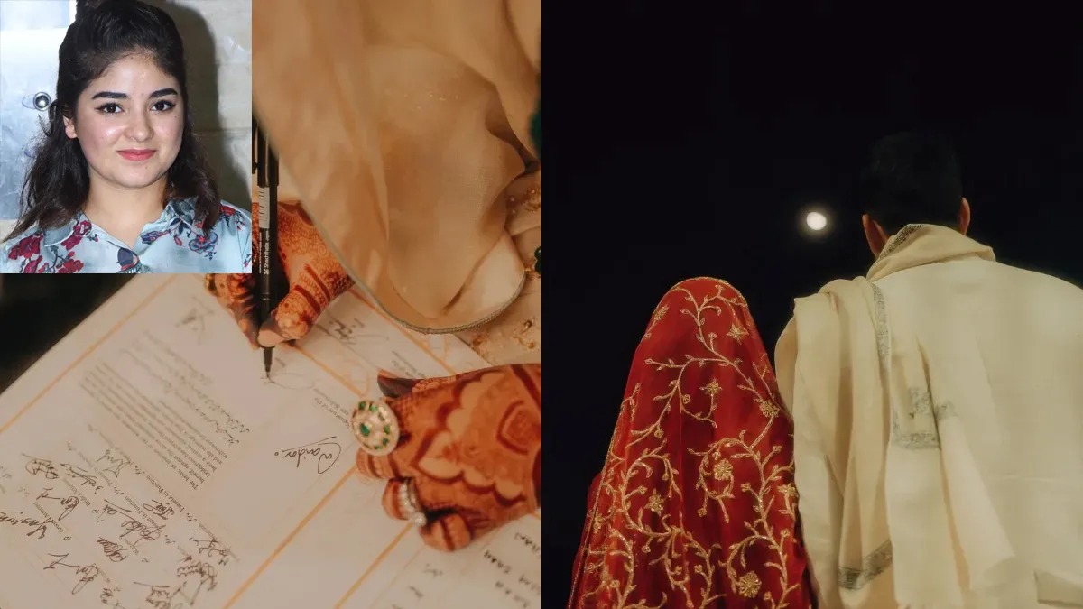 ਜ਼ਾਇਰਾ ਨੇ ਆਪਣੇ ਅਧਿਕਾਰਤ ਇੰਸਟਾਗ੍ਰਾਮ ਹੈਂਡਲ 'ਤੇ ਦੋ ਤਸਵੀਰਾਂ ਅਪਲੋਡ ਕੀਤੀਆਂ, ਜੋ ਵਿਆਹ ਸਮਾਗਮ ਦੀਆਂ ਸਨ। ਪਹਿਲੀ ਤਸਵੀਰ ਵਿੱਚ, ਉਹ ਆਪਣੇ ਹੱਥਾਂ ਵਿੱਚ ਮਹਿੰਦੀ ਡਿਜ਼ਾਈਨ ਅਤੇ ਇੱਕ ਸੁੰਦਰ ਪੰਨੇ ਦੀ ਅੰਗੂਠੀ ਦੇ ਨਾਲ ਨਿਕਾਹਨਾਮੇ 'ਤੇ ਦਸਤਖਤ ਕਰਦੀ ਦਿਖਾਈ ਦਿੱਤੀ।