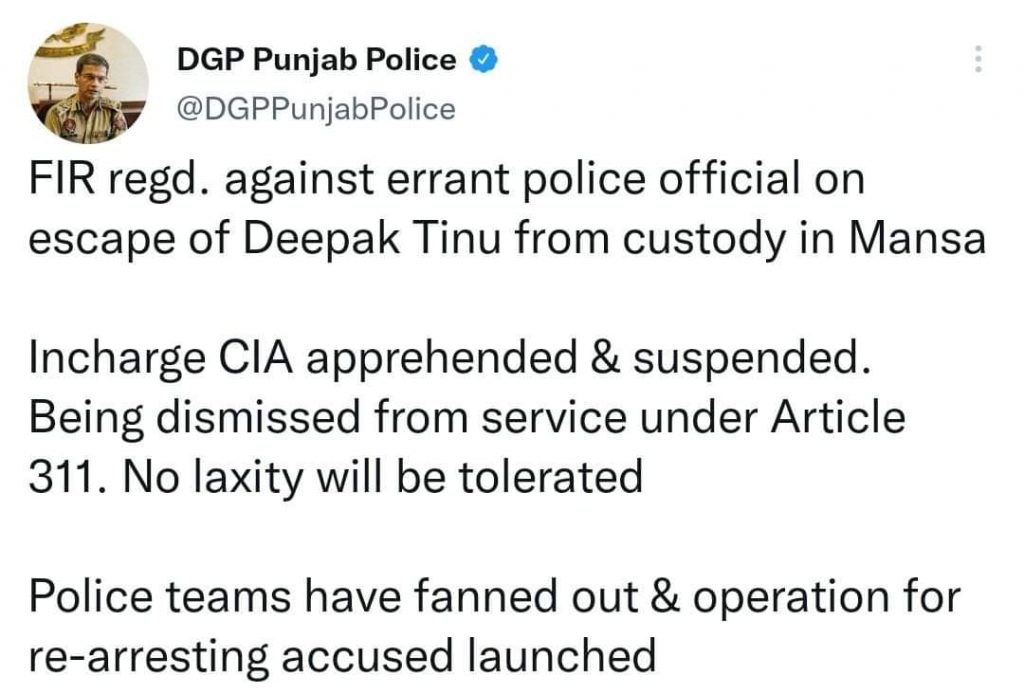 ਇਸ ਬਾਰੇ ਜਾਣਕਾਰੀ DGP ਪੰਜਾਬ ਨੇ ਟਵੀਟ ਕਰਕੇ ਸਾਂਝੀ ਕੀਤੀ ਹੈ। ਉਨ੍ਹਾਂ ਨੇ ਕਿਹਾ ਕਿ CIA ਅਫਸਰਾਂ ਨੂੰ ਮੁਅੱਤਲ ਕਰ ਦਿੱਤਾ ਗਿਆ ਹੈ ਤੇ ਗ੍ਰਿਫਤਾਰ ਕਰ ਲਿਆ ਗਿਆ ਹੈ। ਇਸ ਮਾਮਲੇ ਵਿੱਚ ਕੀੜੇ ਵੀ ਦੋਸ਼ੀ ਨੂੰ ਬਖਸ਼ਿਆਂ ਨਹੀਂ ਜਾਵੇਗਾ। DGP ਗੌਰਵ ਨੇ ਕਿਹਾ ਪੰਜਾਬ ਪੁਲਿਸ ਵਲੋਂ ਗੈਂਗਸਟਰ ਟੀਨੂੰ ਨੂੰ ਗ੍ਰਿਫਤਾਰ ਕਰਨ ਲਈ ਛਾਪੇਮਾਰੀ ਕੀਤੀ ਜਾ ਰਹੀ ਹੈ। ਜ਼ਿਕਰਯੋਗ ਹੈ ਕਿ ਗੈਂਗਸਟਰ ਦੀਪਕ ਟੀਨੂ ਅੱਜ ਪੁਲਿਸ ਦੀ ਹਿਰਾਸਤ ਵਿੱਚੋ ਫਰਾਰ ਹੋ ਗਿਆ ਹੈ। ਜਿਸ ਕਾਰਨ ਪੁਲਿਸ ਪ੍ਰਸ਼ਾਸਨ ਤੇ CM ਮਾਨ ਤੇ ਵੀ ਵਿਰੋਧੀਆਂ ਵਲੋਂ ਉਗਲਾਂ ਚੁੱਕਿਆ ਜਾ ਰਿਹਾ ਹਨ ।