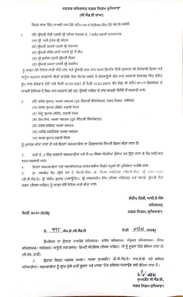 ਲੁਧਿਆਣਾ ਨਿਗਮ ਦੇ ਇੰਸਪੈਕਟਰ ਸਮੇਤ 7 ਖ਼ਿਲਾਫ਼ FIR: 1.75 ਕਰੋੜ ਰੁਪਏ ਗਬਨ ਦਾ ਮਾਮਲਾ, ਸੱਤ ਮੁਲਾਜ਼ਮ ਮੁਅੱਤਲ
