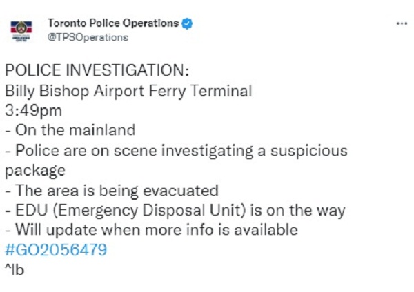 ਪੁਲਿਸ ਨੇ ਟਵੀਟ ਕੀਤਾ ਕਿ ਅਸੀਂ ਇਕ ਵਿਸਫੋਟਕ ਯੰਤਰ ਨਾਲ ਨਜਿੱਠਣ ਲਈ ਕੰਮ ਕਰ ਰਹੇ ਹਾਂ। ਇਸ ਮਾਮਲੇ ਨੂੰ ਲੈ ਕੇ 2 ਰਿਹਾਇਸ਼ੀ ਇਮਾਰਤਾਂ ਨੂੰ ਖਾਲੀ ਕਰਵਾ ਲਿਆ ਗਿਆ ਹੈ। ਰਨਵੇਅ ਬੰਦ ਕਰ ਦਿੱਤਾ ਗਿਆ ਹੈ, ਏਅਰ ਕੈਨੇਡਾ ਦੀਆਂ ਉਡਾਣਾਂ ਨੂੰ ਮੋੜ ਦਿੱਤਾ ਗਿਆ ਹੈ ।