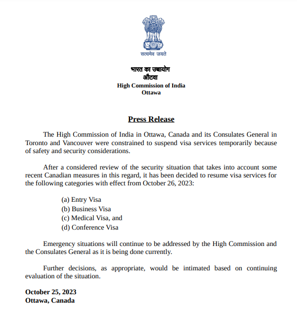 ਹਾਈ ਕਮਿਸ਼ਨ ਨੇ ਬਿਆਨ 'ਚ ਅੱਗੇ ਕਿਹਾ ਕਿ ਸੁਰੱਖਿਆ ਨੂੰ ਧਿਆਨ 'ਚ ਰੱਖਦੇ ਹੋਏ ਪਹਿਲਾਂ ਅਸਥਾਈ ਵੀਜ਼ਾ ਦੇਣ 'ਤੇ ਰੋਕ ਲਗਾ ਦਿੱਤੀ ਗਈ ਸੀ। ਅਜਿਹੇ 'ਚ ਸੁਰੱਖਿਆ ਸਥਿਤੀ ਦਾ ਜਾਇਜ਼ਾ ਲੈਣ ਤੋਂ ਬਾਅਦ ਵੀਜ਼ਾ ਸੇਵਾ ਦੁਬਾਰਾ ਸ਼ੁਰੂ ਕੀਤੀ ਗਈ ਹੈ। ਇਹ ਫੈਸਲਾ ਵੀਰਵਾਰ (26 ਅਕਤੂਬਰ) ਤੋਂ ਲਾਗੂ ਹੋਵੇਗਾ।
