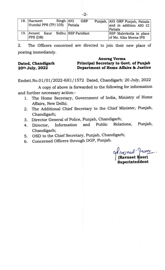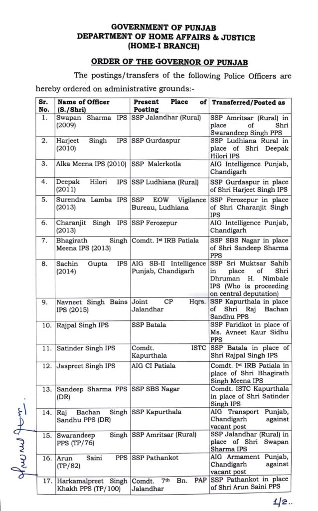 ਨਿਊਜ਼ ਡੈਸਕ : ਪੰਜਾਬ ਵਿਚ ਆਮ ਆਦਮੀ ਦੀ ਸਰਕਾਕ ਬਣਨ ਤੋਂ ਬਾਅਦ ਤਬਾਦਲਿਆਂ ਦਾ ਦੌਰ ਲਗਾਤਾਰ ਜਾਰੀ ਹੈ। ਮਾਨ ਸਰਕਾਰ ਵੱਲੋਂ ਪੁਲਸ ਪ੍ਰਸ਼ਾਸਨ ਦੇ ਕਈ ਅਧਿਕਾਰੀਆਂ ਨੂੰ ਇਧਰੋਂ ਉਧਰ ਕਿਤਾ ਗਿਆ ਹੈ। ਕੁਝ SSPs ਪੱਧਰ ਦੇ ਅਧਿਕਾਰੀਆਂ ਦੇ ਤਬਾਦਲੇ ਕੀਤੇ ਗਏ ਹਨ, ਜਿਨ੍ਹਾਂ 'ਚ Jalandhar, Amritsar ਤੇ Ludhiana ਦਿਹਾਤੀ ਦੇ SSP ਸਮੇਤ 19 ਅਫਸਰਾਂ ਦਾ ਤਬਾਦਲਾ ਕਰ ਦਿੱਤਾ ਗਿਆ ਹੈ।