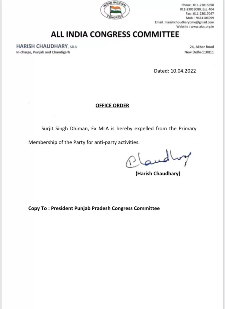 ਨਿਊਜ਼ ਡੈਸਕ : ਕਾਂਗਰਸ ਪ੍ਰਧਾਨ ਅਮਰਿੰਦਰ ਸਿੰਘ ਰਾਜਾ ਵੜਿੰਗ ਖਿਲਾਫ ਬਿਆਨਬਾਜ਼ੀ ਕਰਨਾ ਅਮਰਗੜ੍ਹ ਤੋਂ ਸਾਬਕਾ ਵਿਧਾਇਕ ਸੁਰਜੀਤ ਸਿੰਘ ਧੀਮਾਨ ਨੂੰ ਮਹਿੰਗਾ ਪੈ ਗਿਆ ਹੈ । ਪਾਰਟੀ ਵਿਰੋਧੀ ਗਤੀਵਿਧੀਆਂ ਲਈ ਧੀਮਾਨ ਨੂੰ ਪਾਰਟੀ 'ਚੋਂ ਬਾਹਰ ਦਾ ਰਸਤਾ ਦਿਖਾ ਦਿੱਤਾ ਗਿਆ ਹੈ । ਧੀਮਾਨ ਨੇ 2017 'ਚ ਅਮਰਗੜ੍ਹ ਤੋਂ ਚੋਣ ਜਿੱਤੀ ਜੋ ਕਿ ਕੈਪਟਨ ਦੇ ਖਿਲਾਫ ਅਤੇ ਸਿੱਧੂ ਦੇ ਹੱਕ 'ਚ ਸੀ।