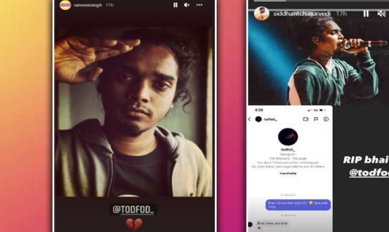 ਅਭਿਨੇਤਾ ਸਿਧਾਂਤ ਚਤੁਰਵੇਦੀ ਨੇ ਵੀ ਕੇ ਸਾਬੋਟੇਜ ਨਾਲ ਗੱਲਬਾਤ ਸਾਂਝੀ ਕਰਕੇ ਆਪਣੀ ਇੰਸਟਾ ਸਟੋਰੀ 'ਤੇ ਦਿਲ ਤੋੜਨ ਵਾਲਾ ਇਮੋਜੀ ਸਾਂਝਾ ਕੀਤਾ। ਉਸਨੇ ਇਹ ਵੀ ਲਿਖਿਆ, RIP ਭਾਈ। ਦੱਸ ਦੇਈਏ ਕਿ ਰਣਵੀਰ ਸਿੰਘ ਨੇ ਫਿਲਮ 'ਗਲੀ ਬੁਆਏ' ਦੇ ਸਾਉਂਡਟ੍ਰੈਕ ਦੇ ਇੱਕ ਟ੍ਰੈਕ ਨੂੰ ਆਪਣੀ ਆਵਾਜ਼ ਦਿੱਤੀ ਹੈ। ਜ਼ੋਇਆ ਅਖਤਰ ਦੇ ਨਿਰਦੇਸ਼ਨ 'ਚ ਬਣੀ ਇਸ ਫਿਲਮ 'ਚ ਆਲੀਆ ਭੱਟ, ਕਲਕੀ ਕੋਚਲਿਨ, ਵਿਜੇ ਵਰਮਾ ਨੇ ਵੀ ਅਹਿਮ ਭੂਮਿਕਾਵਾਂ ਨਿਭਾਈਆਂ ਹਨ।