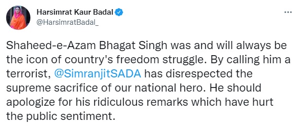 ਨਿਊਜ਼ ਡੈਸਕ : ਸ਼੍ਰੋਮਣੀ ਅਕਾਲੀ ਦਲ (ਅ) Shiromni Akali Dal Amritsar ਦੇ ਪ੍ਰਧਾਨ ਤੇ ਸੰਗਰੂਰ ਤੋਂ ਸੰਸਦ ਮੈਂਬਰ ਸਿਮਰਨਜੀਤ ਸਿੰਘ ਮਾਨ Simranjit Singh Mann ਸ਼ਹੀਦ ਭਗਤ ਸਿੰਘ Shahid Bhagat Singh ਸਬੰਧੀ ਵਿਵਾਦਿਤ ਬਿਆਨ ਕਾਰਨ ਬੁਰੀ ਤਰ੍ਹਾਂ ਘਿਰਦੇ ਨਜ਼ਰ ਆ ਰਹੇ ਹਨ। ਮਾਨ ਦੇ ਇਸ ਵਿਵਾਦਿਤ ਬਿਆਨ ਨੂੰ ਲੈ ਕੇ ਸੰਸਦ ਮੈਂਬਰ ਹਰਸਿਮਰਤ ਕੌਰ ਬਾਦਲ Harsimrat Kaur Badal ਨੇ ਟਵੀਟ Tweet ਕਰਦਿਆਂ ਕਿਹਾ ਕਿ ਸ਼ਹੀਦ-ਏ-ਆਜ਼ਮ ਭਗਤ ਸਿੰਘ ਦੇਸ਼ ਦੀ ਆਜ਼ਾਦੀ ਦੇ ਸੰਘਰਸ਼ ਦੇ ਪ੍ਰਤੀਕ ਸਨ ਤੇ ਹਮੇਸ਼ਾ ਰਹਿਣਗੇ।