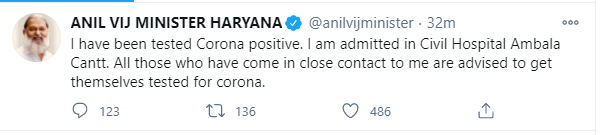 ਜਿਕਰੇਖ਼ਾਸ ਹੈ ਕਿ ਕੁਝ ਦਿਨ ਪਹਿਲਾ ਓਹਨਾ ਨੇ ਕੋਵਿਕਿਨ ਟੈਸਟ ਵਿੱਚ ਇੱਕ ਵਲੰਟੀਅਰ ਵਜੋਂ ਆਪਣੇ ਆਪ ਨੂੰ ਟੀਕਾ ਲਗਵਾਇਆ ਸੀ ਤੇ ਹੁਣ ਉਹ ਖੁਦ ਕੋਰੋਨਾ ਪਾਜ਼ਿਟਿਵ ਪਾਏ ਗਏ ਨੇ ਤੇ ਜਿਸਦੀ ਜਾਣਕਾਰੀ ਓਹਨਾ ਨੇ ਇਕ ਟਵੀਟ ਰਹੀ ਦਿਤੀ ਜਿਸ ਵਿੱਚ ਓਹਨਾ ਨੇ ਲਿਖਿਆ ਮੈਨੂੰ ਕੋਰੋਨਾ ਸਕਾਰਾਤਮਕ ਟੈਸਟ ਕੀਤਾ ਗਿਆ ਹੈ. ਮੈਂ ਸਿਵਲ ਹਸਪਤਾਲ ਅੰਬਾਲਾ ਕੈਂਟ ਵਿਖੇ ਦਾਖਲ ਹਾਂ। ਉਹ ਸਾਰੇ ਜੋ ਮੇਰੇ ਨਾਲ ਨੇੜਲੇ ਸੰਪਰਕ ਵਿੱਚ ਆਏ ਹਨ ਉਹਨਾਂ ਨੂੰ ਆਪਣੇ ਆਪ ਨੂੰ ਕੋਰੋਨਾ ਲਈ ਟੈਸਟ ਕਰਵਾਉਣ ਦੀ ਸਲਾਹ ਦਿੱਤੀ ਜਾਂਦੀ ਹੈ.