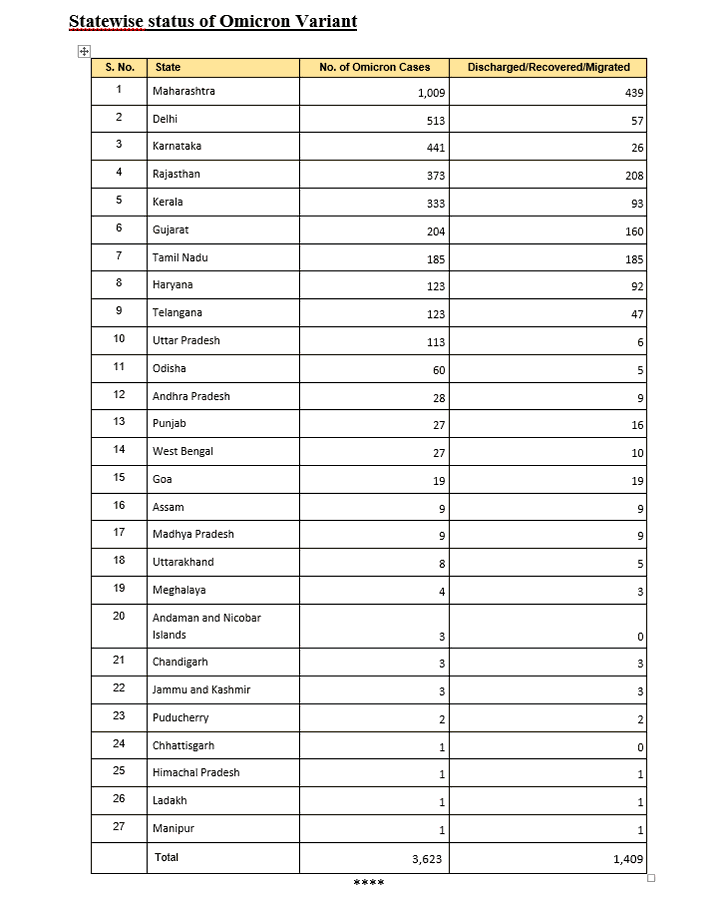 ਮਹਾਰਾਸ਼ਟਰ 'ਚ ਸਭ ਤੋਂ ਵੱਧ ਓਮੀਕਰੋਨ (1,009) ਕੇਸ ਦਰਜ ਕੀਤੇ ਗਏ ਹਨ, ਇਸ ਤੋਂ ਬਾਅਦ ਦਿੱਲੀ (513), ਕਰਨਾਟਕ (441), ਰਾਜਸਥਾਨ (373), ਕੇਰਲਾ (333) ਅਤੇ ਗੁਜਰਾਤ (204) ਹਨ। ਤੇਲੰਗਾਨਾ, ਆਂਧਰਾ ਪ੍ਰਦੇਸ਼, ਹਰਿਆਣਾ, ਪੱਛਮੀ ਬੰਗਾਲ, ਮੱਧ ਪ੍ਰਦੇਸ਼, ਉੜੀਸਾ, ਉੱਤਰਾਖੰਡ, ਚੰਡੀਗੜ੍ਹ, ਜੰਮੂ-ਕਸ਼ਮੀਰ, ਉੱਤਰ ਪ੍ਰਦੇਸ਼, ਗੋਆ, ਹਿਮਾਚਲ ਪ੍ਰਦੇਸ਼, ਲੱਦਾਖ, ਕੁੱਲ 27 ਰਾਜਾਂ ਅਤੇ ਕੇਂਦਰ ਸ਼ਾਸਤ ਪ੍ਰਦੇਸ਼ਾਂ ਵਿੱਚ ਨਵੇਂ ਰੂਪ ਦੇ ਮਾਮਲੇ ਸਾਹਮਣੇ ਆਏ ਹਨ। ਮਨੀਪੁਰ ਅਤੇ ਪੰਜਾਬ।