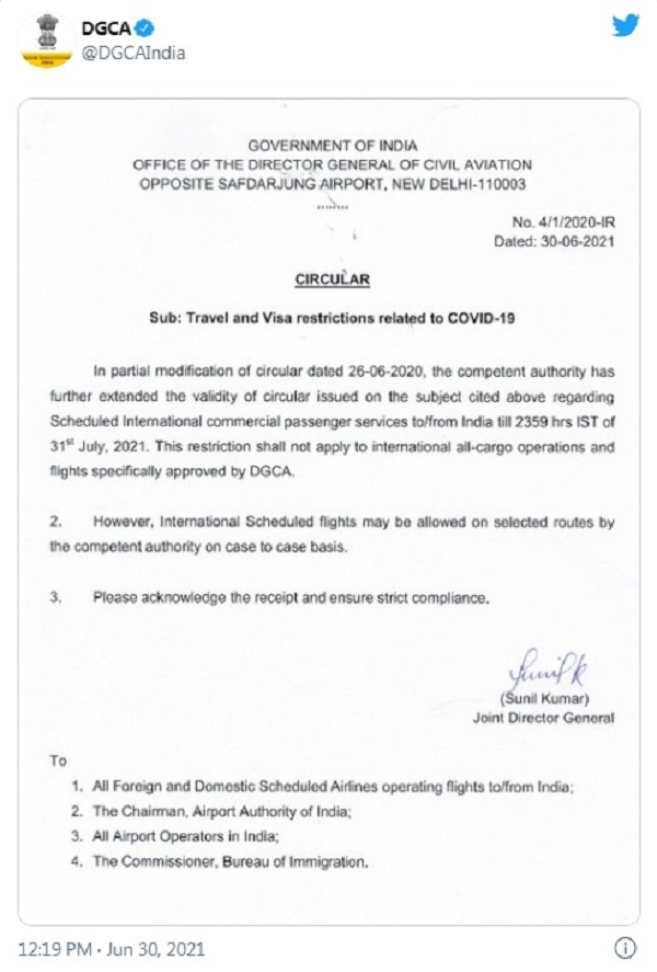 ਡਾਇਰੈਕਟੋਰੇਟ ਜਨਰਲ ਆਫ ਸਿਵਲ ਏਵੀਏਸ਼ਨ (DGCA) ਨੇ ਅੰਤਰਰਾਸ਼ਟਰੀ ਵਪਾਰਕ ਯਾਤਰੀ ਉਡਾਣਾਂ 'ਤੇ ਪਾਬੰਦੀ 31 ਜੁਲਾਈ. 2021 ਤੱਕ ਵਧਾ ਦਿੱਤੀ ਹੈ। ਦੇਸ਼ ਵਿਚ ਡੈਲਟਾ ਪਲੱਸ ਵੈਰੀਐਂਟ ਦੇ ਵੱਧਦੇ ਮਾਮਲਿਆਂ ਅਤੇ ਤੀਜੀ ਲਹਿਰ ਦੇ ਖਦਸ਼ੇ ਵਿਚਕਾਰ ਡੀ.ਜੀ.ਸੀ.ਏ. ਨੇ ਅਹਿਮ ਫ਼ੈਸਲਾ ਲਿਆ ਹੈ।