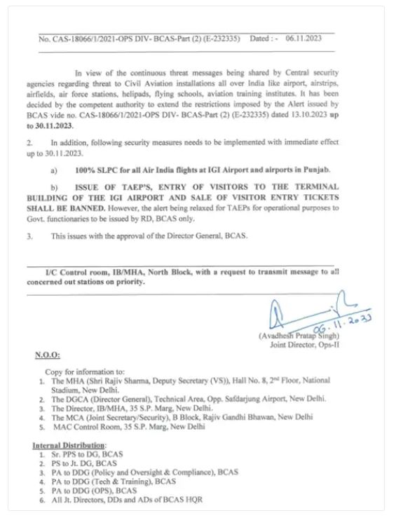 ਬਿਊਰੋ ਆਫ ਸਿਵਲ ਏਵੀਏਸ਼ਨ ਸਕਿਓਰਿਟੀ ਵੱਲੋਂ ਜਾਰੀ ਪੱਤਰ ਵਿੱਚ ਕਿਹਾ ਗਿਆ ਹੈ ਕਿ - ਏਅਰ ਇੰਡੀਆ ਦੇ ਯਾਤਰੀਆਂ ਨੂੰ 30 ਨਵੰਬਰ ਤੱਕ ਦਿੱਲੀ ਦੇ ਆਈਜੀਆਈ ਹਵਾਈ ਅੱਡੇ ਅਤੇ ਪੰਜਾਬ ਦੇ ਸਾਰੇ ਹਵਾਈ ਅੱਡਿਆਂ 'ਤੇ ਦੋਹਰੀ ਸੁਰੱਖਿਆ ਜਾਂਚਾਂ ਵਿੱਚੋਂ ਗੁਜ਼ਰਨਾ ਪਵੇਗਾ। ਜਿਸ ਕਾਰਨ ਯਾਤਰੀਆਂ ਦਾ ਕਾਫੀ ਸਮਾਂ ਬਰਬਾਦ ਹੋਵੇਗਾ ਪਰ ਸੁਰੱਖਿਆ ਨੂੰ ਮੁੱਖ ਰੱਖਦਿਆਂ ਸਰਕਾਰ ਨੇ ਇਸ ਫੈਸਲੇ ਨੂੰ ਸਖ਼ਤੀ ਨਾਲ ਲਾਗੂ ਕਰਨ ਦੇ ਹੁਕਮ ਦਿੱਤੇ ਹਨ।