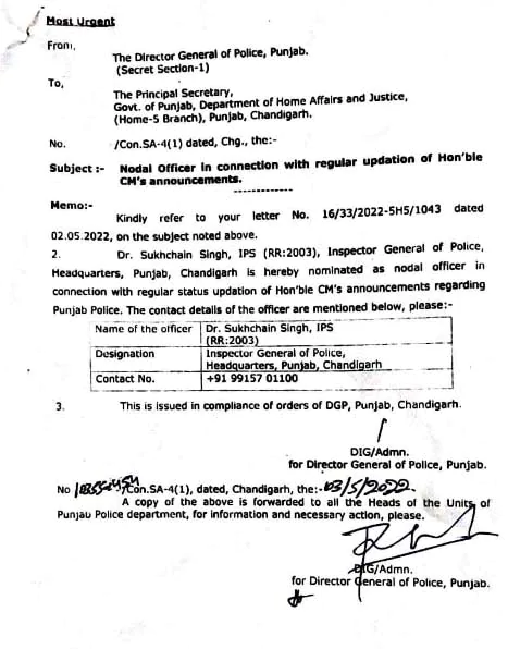 ਨਿਊਜ਼ ਡੈਸਕ : ਸੂਬੇ ਵਿੱਚ ਕਾਨੂੰਨ ਵਿਵਸਥਾ ਕਾਇਮ ਰੱਖਣ ਲਈ ਪੰਜਾਬ ਸਰਕਾਰ ਨੇ ਸੂਬੇ ਦੇ ਸੀਨੀਅਰ ਆਈਪੀਐਸ ਅਧਿਕਾਰੀ ਨੂੰ ਵੱਡੀ ਜ਼ਿੰਮੇਵਾਰੀ ਸੌਂਪੀ ਹੈ। ਡੀਜੀਪੀ ਪੰਜਾਬ ਨੇ ਸੁਖਚੈਨ ਸਿੰਘ ਗਿੱਲ ਨੂੰ ਮੁੱਖ ਮੰਤਰੀ ਦੇ ਨਾਲ ਨੋਡਲ ਅਫਸਰ ਨਿਯੁਕਤ ਕੀਤਾ ਗਿਆ ਹੈ।