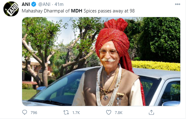 ਨਵੀਂ ਦਿੱਲੀ(ਐਨ .ਆਰ .ਆਈ ਮੀਡਿਆ ) : ਐਮਡੀਐਚ ਮਸਾਲੇ ਦੇ ਮਾਲਕ ਧਰਮਪਾਲ ਦੀ 98 ਸਾਲ ਦੀ ਉਮਰ ਵਿੱਚ ਮੌਤ ਹੋ ਗਈ। ਦੱਸਿਆ ਜਾ ਰਿਹਾ ਹੈ ਕਿ ਉਹਨਾ ਦੀ ਮੌਤ ਅੱਜ ਸਵੇਰੇ 5:30 ਪੰਜ ਵਜੇ ਦਿਲ ਦਾ ਦੌਰਾ ਪੈਣ ਕਾਰਨ ਹੋਈ। ਪਿਛਲੇ 3 ਹਫ਼ਤਿਆਂ ਤੋਂ ਉਹਨਾਂ ਦਾ ਦਿੱਲੀ ਵਿੱਚ ਇਲਾਜ ਚੱਲ ਰਿਹਾ ਸੀ। ਧਰਮਪਾਲ ਗੁਲਾਟੀ ਦਾ ਜਨਮ 27 ਮਾਰਚ 1923 ਨੂੰ ਸਿਆਲਕੋਟ, ਪਾਕਿਸਤਾਨ ਵਿੱਚ ਹੋਇਆ ਸੀ।
