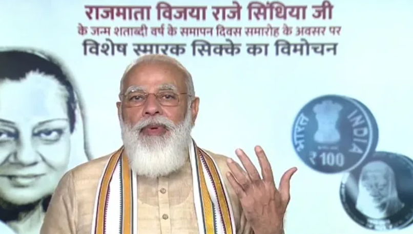 ਵੈੱਬ ਡੈਸਕ (ਐਨ.ਆਰ.ਆਈ.ਮੀਡਿਆ) : ਭਾਰਤੀ ਪ੍ਰਧਾਨ ਮੰਤਰੀ ਨਰਿੰਦਰ ਮੋਦੀ ਨੇ ਵਿਜੈ ਰਾਜੇ ਸਿੰਧੀਆ ਦੀ ਜਯੰਤੀ ਤੇ ਅੱਜ ਇੱਕ ਵਰਚੁਅਲ ਸਮਾਗਮ ਵਿੱਚ ਉਨ੍ਹਾਂ ਦੇ ਸਨਮਾਨ ਵਿੱਚ 100 ਰੁਪਏ ਦਾ ਯਾਦਗਾਰੀ ਸਿੱਕਾ ਜਾਰੀ ਕੀਤਾ। ਜਨਮ ਸ਼ਤਾਬਦੀ ਉਤਸਵ ਸਮੇਂ ਇਸ ਵਿਸ਼ੇਸ਼ ਯਾਦਗਾਰੀ ਸਿੱਕੇ ਦੀ ਕਲਪਨਾ ਵਿੱਤ ਮੰਤਰਾਲੇ ਨੇ ਕੀਤੀ। ਮੋਦੀ ਸੋਮਵਾਰ ਨੂੰ ਵਿਜੈ ਰਾਜੇ ਸਿੰਧੀਆ ਦੇ ਜਨਮ ਦਿਵਸ ਉੱਤੇ 100 ਰੁਪਏ ਦਾ ਯਾਦਗਾਰੀ ਸਿੱਕਾ ਜਾਰੀ ਕੀਤਾ।