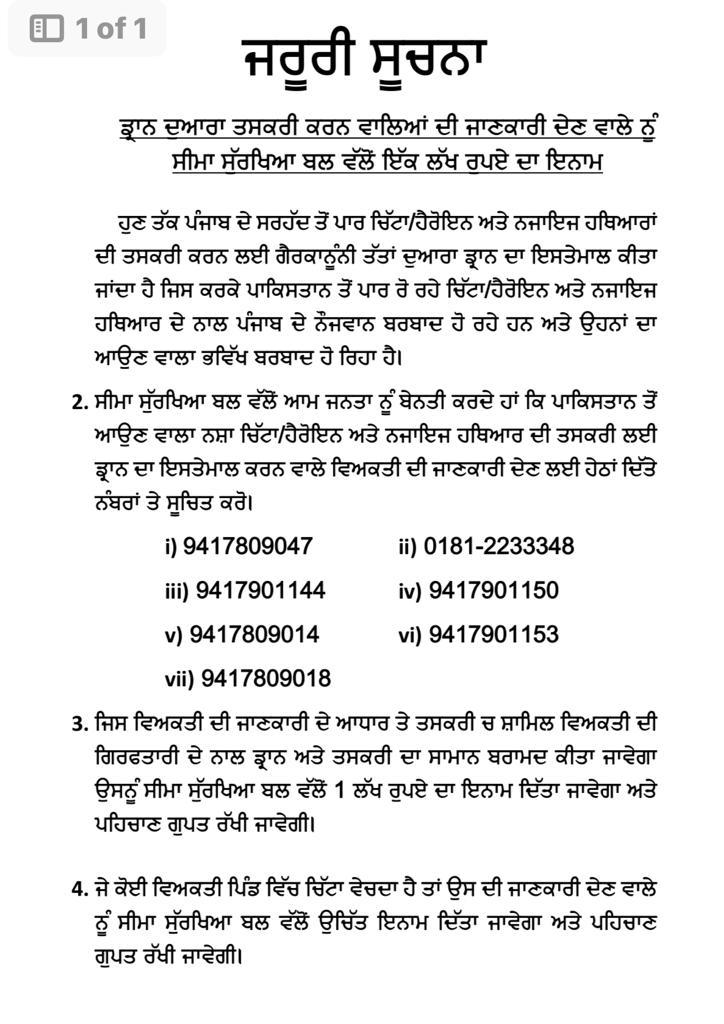 ਨਿਊਜ਼ ਡੈਸਕ (ਰਿੰਪੀ ਸ਼ਰਮਾ) : BSF ਵਲੋਂ ਆਮ ਜਨਤਾ ਨੂੰ ਅਪੀਲ ਕੀਤੀ ਗਈ ਹੈ ਕਿ ਜੋ ਵੀ ਪਾਕਿਸਤਾਨ ਤੋਂ ਆਉਣ ਵਾਲਾ ਨਸ਼ਾ,ਨਾਜਾਇਜ਼ ਹਥਿਆਰ ਤੇ ਡਰੋਨ ਦਾ ਇਸਲੇਮਾਲ ਕਰਨ ਵਾਲੇ ਵਿਅਕਤੀ ਦੀ ਜਾਣਕਾਰੀ ਦੇਵਗਾ। ਉਸ ਨੂੰ 1 ਲੱਖ ਰੁਪਏ ਦਾ ਇਨਾਮ ਦਿੱਤਾ ਜਾਵੇਗਾ। ਉਨ੍ਹਾਂ ਨੇ ਕਿਹਾ ਕਿ ਹੁਣ ਤੱਕ ਪੰਜਾਬ ਦੇ ਨੌਜਵਾਨ ਨਸ਼ਾ, ਹੈਰੋਇਨ ਤੇ ਨਾਜਾਇਜ਼ ਹਥਿਆਰਾਂ ਦੀ ਗੈਰ -ਕਾਨੂੰਨੀ ਤਸਕਰੀ ਕਰਦੇ ਹਨ । ਜਿਸ ਕਾਰਨ ਪੰਜਾਬ ਦੇ ਨੌਜਵਾਨਾਂ ਦਾ ਭਵਿੱਖ ਬਰਬਾਦ ਹੋ ਰਿਹਾ ਹੈ । BSF ਅਧਿਕਾਰੀਆਂ ਨੇ ਲੋਕਾਂ ਨੂੰ ਪਾਕਿਸਤਾਨ ਤੋਂ ਆਉਣ ਵਾਲੇ ਨਸ਼ੀਲੇ ਪਦਾਰਥਾਂ ਤੇ ਡਰੋਨ ਬਾਰੇ ਜਾਣਕਾਰੀ ਸਾਂਝੀ ਕਰਨ ਲਈ 9417809047 ਤੇ ਹੋਰ ਵੀ ਕਈ ਨੰਬਰ ਜਾਂਰੀ ਕੀਤੇ ਹਨ। ਅਧਿਕਾਰੀਆਂ ਨੇ ਕਿਹਾ ਕਿ ਇਹ ਸੂਚਨਾ ਦੇਣ ਵਾਲਿਆਂ ਦੇ ਨਾਂ ਨੂੰ ਪੂਰੀ ਤਰਾਂ ਗੁਪਤ ਰੱਖਿਆ ਜਾਵੇਗਾ।