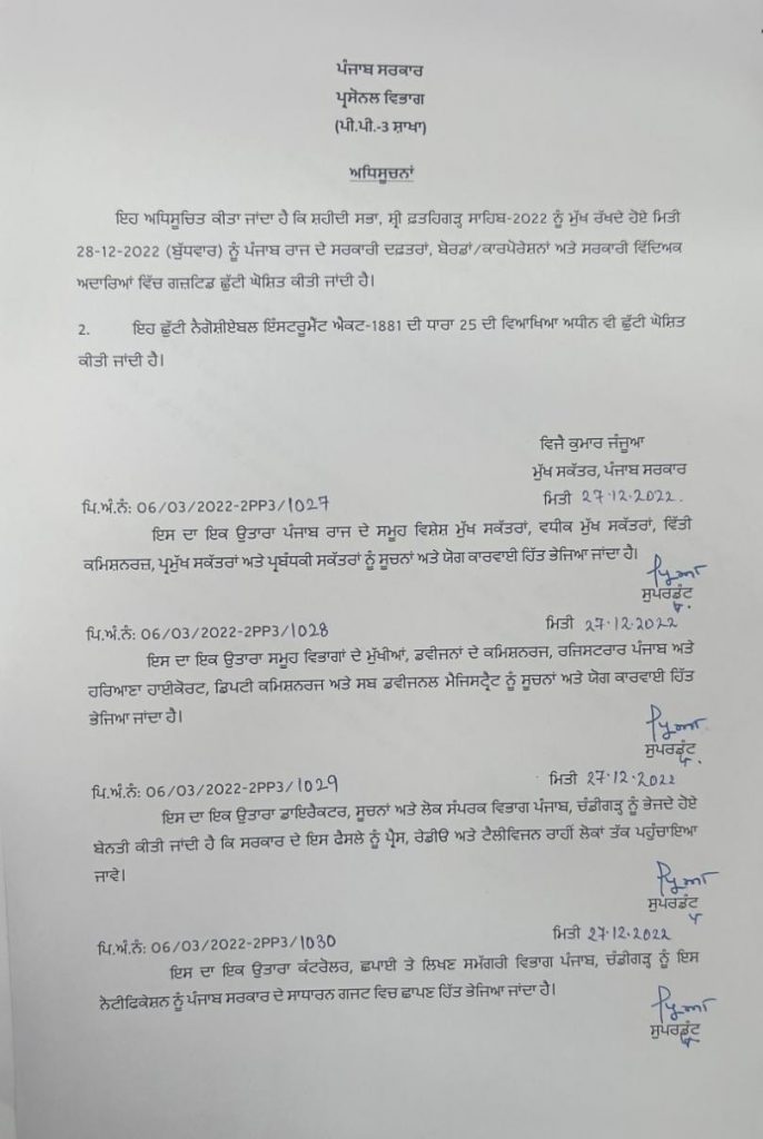 ਨਿਊਜ਼ ਡੈਸਕ (ਰਿੰਪੀ ਸ਼ਰਮਾ) : ਪੰਜਾਬ ਸਰਕਾਰ ਵਲੋਂ 28 ਦਸੰਬਰ ਨੂੰ ਸੂਬੇ 'ਚ ਸਰਕਾਰੀ ਛੁੱਟੀ ਦਾ ਐਲਾਨ ਕੀਤਾ ਗਿਆ। ਨੋਟੀਫਿਕੇਸ਼ਨ ਅਨੁਸਾਰ ਸ਼੍ਰੀ ਫਤਿਹਗ੍ਹੜ ਸਾਹਿਬ ਵਿੱਚ ਸ਼ਹੀਦੀ ਸਭਾ ਦੇ ਸਬੰਧ ਵਿੱਚ 28 ਦਸੰਬਰ ਨੂੰ ਛੁੱਟੀ ਹੋਵੇਗੀ। ਇਸ ਦੌਰਾਨ ਸਾਰੇ ਸਰਕਾਰੀ ਦਫ਼ਤਰ, ਨਗਰ ਨਿਗਮ ਆਦਿ ਬੰਦ ਰਹਿਣਗੇ ।