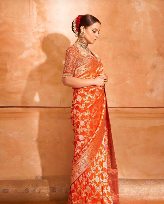 ਇੱਕ ਨਵੀਂ ਵਹੁਟੀ ਦੀ ਅਲਮਾਰੀ ਵਿੱਚ ਇੱਕ ਜਾਂ ਦੋ ਬਨਾਰਸੀ ਸਾੜੀਆਂ ਹੋਣੀਆਂ ਚਾਹੀਦੀਆਂ ਹਨ। ਜੋ ਕਿ ਹਰ ਮੌਕੇ ਲਈ ਸਭ ਤੋਂ ਵਧੀਆ ਹੈ, ਇਸ ਲਈ ਕਰਵਾ ਚੌਥ 'ਤੇ ਤੁਸੀਂ ਵੀ ਵਿਆਹ ਦੀ ਕੋਈ ਵੀ ਬਨਾਰਸੀ ਸਾੜੀ ਵੀ ਪਹਿਨ ਸਕਦੇ ਹੋ। ਤਿਉਹਾਰਾਂ ਦੇ ਮੌਕਿਆਂ 'ਤੇ ਲਾਲ, ਸੰਤਰੀ, ਪੀਲਾ ਸਭ ਤੋਂ ਵੱਧ ਪਹਿਨੇ ਜਾਣ ਵਾਲੇ ਰੰਗ ਹਨ। ਬਨਾਰਸੀ ਸਾੜੀ ਦੇ ਨਾਲ ਜ਼ਰਦੋਜ਼ੀ ਵਰਕ ਬਲਾਊਜ਼ ਪਹਿਨ ਕੇ ਆਪਣੀ ਦਿੱਖ ਨੂੰ ਵਧਾਓ।