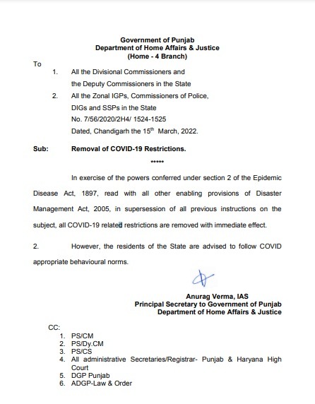 ਨਿਊਜ਼ ਡੈਸਕ (ਰਿੰਪੀ ਸ਼ਰਮਾ) : ਕੋਰੋਨਾ ਦਾ ਕਹਿਰ ਘੱਟ ਹੋ ਗਿਆ ਹੈ। ਇਸ ਨੂੰ ਦੇਖਦੇ ਹੋਏ ਪੰਜਾਬ ਸਰਕਾਰ ਨੇ ਲੋਕਾਂ ਨੂੰ ਵੱਡੀ ਰਾਹਤ ਦਿੱਤੀ ਹੈ। ਪੰਜਾਬ ਸਰਕਾਰ ਵੱਲੋਂ ਸਾਰੇ ਜ਼ਿਲ੍ਹਿਆਂ ਦੇ ਡਿਪਟੀ ਕਮਿਸ਼ਨਰਾਂ ਨੂੰ ਹੁਕਮ ਦਿੱਤੇ ਹਨ ਕਿ ਕੋਰੋਨਾ ਦੇ ਮੱਦੇਨਜ਼ਰ ਲਾਈਆਂ ਗਈਆਂ ਪਾਬੰਦੀਆਂ ਨੂੰ ਪੂਰਨ ਤੌਰ 'ਤੇ ਹਟਾ ਦਿੱਤਾ ਜਾਵੇ। ਨਾਲ ਹੀ ਸਰਕਾਰ ਨੇ ਲੋਕਾਂ ਨੂੰ ਅਪੀਲ ਕੀਤੀ ਹੈ ਕਿ ਉਹ ਮਾਸਕ ਪਾ ਕੇ ਰੱਖਣ ਅਤੇ ਕੋਰੋਨਾ ਦਿਸ਼ਾ-ਨਿਰਦੇਸ਼ਾਂ ਦੀ ਪਾਲਣਾ ਕਰਦੇ ਰਹਿਣ ਤਾਂ ਜੋ ਇਹ ਮਹਾਮਾਰੀ ਦੁਬਾਰਾ ਨਾ ਫੈਲ ਸਕੇ।
