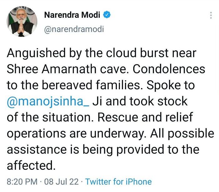 PM ਨੇ ਟਵੀਟ ਕਰ ਕੇ ਕਿਹਾ, ''ਅਮਰਨਾਥ ਗੁਫਾ ਦੇ ਹਾਦਸੇ ਤੋਂ ਦੁਖੀ ਹਾਂ। ਉਪ ਰਾਜਪਾਲ ਮਨੋਜ ਸਿਨਹਾ ਨੇ ਸਥਿਤੀ ਦਾ ਜਾਇਜ਼ਾ ਲਿਆ ਹੈ। ਮੌਕੇ 'ਤੇ ਰਾਹਤ ਅਤੇ ਬਚਾਅ ਕਾਰਜ ਜਾਰੀ ਹਨ। ਦੁਖੀ ਪਰਿਵਾਰਾਂ ਪ੍ਰਤੀ ਮੇਰੀ ਸੰਵੇਦਨਾ ਹੈ।'