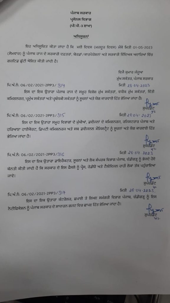 ਨਿਊਜ਼ ਡੈਸਕ (ਰਿੰਪੀ ਸ਼ਰਮਾ) : ਪੰਜਾਬ ਸਰਕਾਰ ਵਲੋਂ ਮਜ਼ਦੂਰ ਦਿਵਸ ਯਾਨੀ 1 ਮਈ ਨੂੰ ਸਰਕਾਰੀ ਛੁੱਟੀ ਦਾ ਐਲਾਨ ਕੀਤਾ ਗਿਆ ਹੈ। ਇਸ ਮੌਕੇ ਪੰਜਾਬ ਦੇ ਸਾਰੇ ਸਰਕਾਰੀ ਦਫਤਰਾਂ,ਬੋਰਡਾਂ ਬੰਦ ਰਹਿਣਗੇ। ਇਸ ਛੁੱਟੀ ਸਬੰਧੀ ਪੰਜਾਬ ਸਰਕਾਰ ਵਲੋਂ ਇੱਕ ਨੋਟੀਫਿਕੇਸ਼ਨ ਵੀ ਜਾਰੀ ਕੀਤਾ ਗਿਆ ।