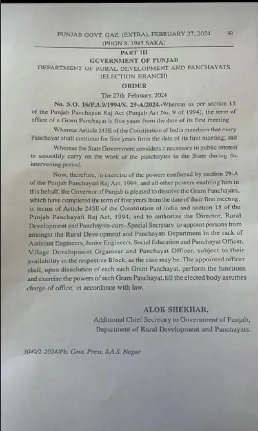 ਪੰਜਾਬ ਸਰਕਾਰ ਨੇ ਪੰਚਾਇਤੀ ਚੋਣਾਂ ਦੀਆਂ ਤਿਆਰੀਆਂ ਸ਼ੁਰੂ ਕਰ ਦਿੱਤੀਆਂ ਹਨ। 5 ਸਾਲ ਦਾ ਕਾਰਜਕਾਲ ਪੂਰਾ ਕਰਨ ਵਾਲੀਆਂ ਪੰਚਾਇਤਾਂ ਨੂੰ ਭੰਗ ਕਰ ਦਿੱਤਾ ਗਿਆ ਹੈ। ਨਵੀਆਂ ਪੰਚਾਇਤਾਂ ਦੀ ਚੋਣ ਹੋਣ ਤੱਕ ਅਧਿਕਾਰੀ ਪੰਚਾਇਤਾਂ ਦਾ ਕੰਮਕਾਜ ਦੇਖਣਗੇ। ਇਸ ਤੋਂ ਪਹਿਲਾਂ ਪੰਚਾਇਤ ਵਿਭਾਗ ਨੇ 10 ਅਗਸਤ ਨੂੰ ਪੰਚਾਇਤਾਂ ਨੂੰ ਭੰਗ ਕਰਨ ਦਾ ਨੋਟੀਫਿਕੇਸ਼ਨ ਜਾਰੀ ਕੀਤਾ ਸੀ।