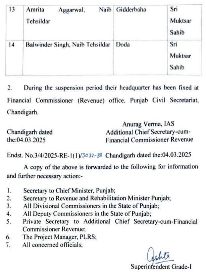 ਲੁਧਿਆਣਾ (ਨੇਹਾ): ਪੰਜਾਬ ਵਿੱਚ ਤਹਿਸੀਲਦਾਰਾਂ ਅਤੇ ਨਾਇਬ ਤਹਿਸੀਲਦਾਰਾਂ ਵਿਰੁੱਧ ਪੰਜਾਬ ਸਰਕਾਰ ਵੱਲੋਂ ਇੱਕ ਵੱਡੀ ਕਾਰਵਾਈ ਦੇਖੀ ਗਈ ਹੈ। ਦੱਸਿਆ ਜਾ ਰਿਹਾ ਹੈ ਕਿ ਪੰਜਾਬ ਸਰਕਾਰ ਨੇ ਕੁੱਲ 14 ਅਧਿਕਾਰੀਆਂ ਨੂੰ ਮੁਅੱਤਲ ਕਰ ਦਿੱਤਾ ਹੈ ਜਿਨ੍ਹਾਂ ਵਿੱਚ 6 ਤਹਿਸੀਲਦਾਰ ਅਤੇ 8 ਨਾਇਬ ਤਹਿਸੀਲਦਾਰ ਸ਼ਾਮਲ ਹਨ। ਇਸ ਸਬੰਧੀ ਪੰਜਾਬ ਸਰਕਾਰ ਨੇ ਅਧਿਕਾਰੀਆਂ ਨੂੰ ਤੁਰੰਤ ਪ੍ਰਭਾਵ ਨਾਲ ਮੁਅੱਤਲ ਕਰਨ ਦੇ ਹੁਕਮ ਜਾਰੀ ਕੀਤੇ ਹਨ। ਜਿਨ੍ਹਾਂ ਅਧਿਕਾਰੀਆਂ ਨੂੰ ਮੁਅੱਤਲ ਕੀਤਾ ਗਿਆ ਹੈ, ਉਨ੍ਹਾਂ ਵਿੱਚ ਗੁਰਮੁਖ ਸਿੰਘ ਤਹਿਸੀਲਦਾਰ ਬਾਘਾਪੁਰਾਣਾ (ਮੋਗਾ), ਭੀਮ ਸੇਨ ਨਾਇਬ ਤਹਿਸੀਲਦਾਰ (ਬਾਘਾਪੁਰਾਣਾ) ਮੋਗਾ, ਅਮਰਪ੍ਰੀਤ ਸਿੰਘ ਨਾਇਬ ਤਹਿਸੀਲਦਾਰ ਸਮਾਲਸਰ (ਮੋਗਾ), ਰਮੇਸ਼ ਢੀਂਗਰਾ ਨਾਇਬ ਤਹਿਸੀਲਦਾਰ (ਧਰਮਕੋਟ) ਮੋਗਾ ਅਤੇ ਹੋਰ ਅਧਿਕਾਰੀ ਸ਼ਾਮਲ ਹਨ। ਇਸ ਲਈ ਸਾਰੇ ਅਧਿਕਾਰੀਆਂ ਦੀ ਸੂਚੀ ਹੇਠਾਂ ਦਿੱਤੀ ਗਈ ਹੈ।