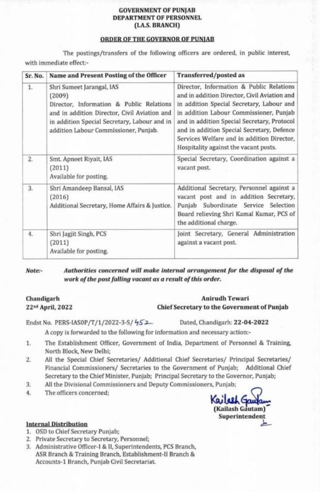 ਨਿਊਜ਼ ਡੈਸਕ : ਪੰਜਾਬ ਸਰਕਾਰ 'ਚ ਤਬਾਦਲਿਆਂ ਦਾ ਦੌਰ ਲਗਾਤਾਰ ਜਾਰੀ ਹੈ। ਆਮ ਆਦਮੀ ਪਾਰਟੀ ਨੇ ਸੱਤਾ 'ਚ ਆਉਂਦੇ ਹੀ ਪੁਲਸ ਅਤੇ ਪ੍ਰਸ਼ਾਸਨਿਕ ਹਲਕਿਆਂ 'ਚ ਕਾਫ਼ੀ ਫੇਰਬਦਲ ਕੀਤਾ ਹੈ, ਇਸ ਤਹਿਤ ਪੰਜਾਬ ਸਰਕਾਰ ਨੇ ਅੱਜ 4 ਅਧਿਕਾਰੀਆਂ ਦੇ ਤਬਾਦਲੇ ਕੀਤੇ ਹਨ, ਜਿਨ੍ਹਾਂ 'ਚ ਆਈਏਐੱਸ ਅਤੇ ਪੀਪੀਐੱਸ ਅਧਿਕਾਰੀ ਸ਼ਾਮਲ ਹਨ। ਆਈ.ਏ.ਐੱਸ. 'ਚ ਸੁਮੀਤ ਜਰਾਂਗਲ, ਅਪਨੀਤ ਰਿਆਤ, ਅਮਨਦੀਪ ਬਾਂਸਲ ਅਤੇ ਪੀਸੀਐੱਸ 'ਚ ਜਗਜੀਤ ਸਿੰਘ ਦਾ ਨਾਂ ਸ਼ਾਮਲ ਹੈ।