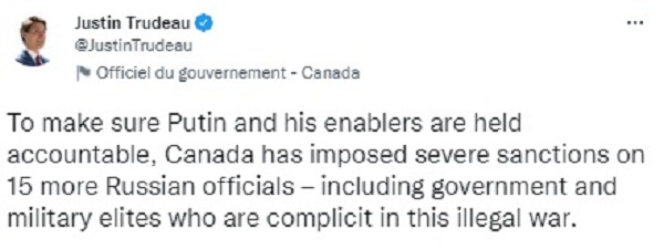 ਨਿਊਜ਼ ਡੈਸਕ : ਪ੍ਰਧਾਨ ਮੰਤਰੀ ਜਸਟਿਨ ਟਰੂਡੋ ਨੇ ਮੰਗਲਵਾਰ (ਸਥਾਨਕ ਸਮੇਂ) ਨੂੰ ਇਕ ਟਵੀਟ 'ਚ ਦੱਸਿਆ ਕਿ ਕੈਨੇਡਾ ਨੇ ਯੂਕਰੇਨ 'ਚ ਜਾਰੀ ਲੜਾਈ ਨੂੰ ਲੈ ਕੇ ਰੂਸ ਦੇ 15 ਹੋਰ ਸਰਕਾਰੀ ਅਧਿਕਾਰੀਆਂ ਵਿਰੁੱਧ ਪਾਬੰਦੀਆਂ ਲਗਾਈਆਂ ਹਨ। ਟਰੂਡੋ ਨੇ ਇਕ ਟਵੀਟ 'ਚ ਕਿਹਾ ਕਿ ਇਹ ਯਕੀਨੀ ਬਣਾਉਣ ਲਈ ਕਿ ਪੁਤਿਨ ਅਤੇ ਉਸਦੇ ਸਮਰਥਕਾਂ ਨੂੰ ਜਵਾਬਦੇਹ ਠਹਿਰਾਇਆ ਜਾਵੇ, ਕੈਨੇਡਾ ਨੇ 15 ਹੋਰ ਰੂਸੀ ਅਧਿਕਾਰੀਆਂ 'ਤੇ ਸਖ਼ਤ ਪਾਬੰਦੀਆਂ ਲਗਾਈਆਂ ਹਨ, ਜਿਸ 'ਚ ਸਰਕਾਰੀ ਤੇ ਫ਼ੌਜੀ ਕੁਲੀਨ ਵਰਗ ਵੀ ਸ਼ਾਮਲ ਹਨ, ਜੋ ਇਸ ਗੈਰ-ਕਾਨੂੰਨੀ ਯੁੱਧ 'ਚ ਸ਼ਾਮਲ ਹਨ। ਰੂਸੀ ਵਿਦੇਸ਼ ਮੰਤਰਾਲੇ ਨੇ ਕਿਹਾ ਕਿ ਪਾਬੰਦੀਆਂ ਦੇ ਜਵਾਬ 'ਚ ਰੂਸ ਕੈਨੇਡੀਅਨ ਪ੍ਰਧਾਨ ਮੰਤਰੀ ਜਸਟਿਨ ਟਰੂਡੋ ਤੇ 300 ਤੋਂ ਵੱਧ ਸੰਸਦ ਮੈਂਬਰਾਂ ਵਿਰੁੱਧ ਜਵਾਬੀ ਪਾਬੰਦੀਆਂ ਲਗਾ ਰਿਹਾ ਹੈ।
