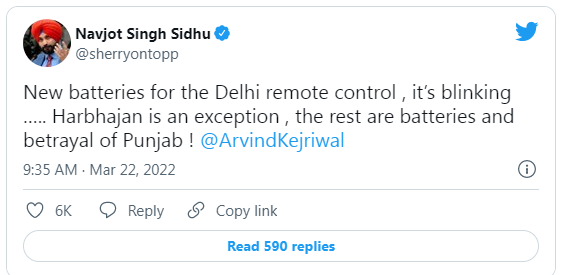 ਸਿੱਧੂ ਨੇ ਦੋਸ਼ ਲਾਇਆ ਕਿ ਰਾਜ ਸਭਾ ਦੇ ਉਮੀਦਵਾਰਾਂ ਰਾਹੀਂ ਦਿੱਲੀ 'ਚ ਬੈਠੇ ਲੋਕ ਪੰਜਾਬ ਸਰਕਾਰ ਨੂੰ ਕੰਟਰੋਲ ਕਰਨਾ ਚਾਹੁੰਦੇ ਹਨ। ਹਾਲਾਂਕਿ ਸਿੱਧੂ ਨੇ ਹਰਭਜਨ ਸਿੰਘ ਨੂੰ ਰਾਜ ਸਭਾ ਲਈ ਚੰਗੀ ਚੁਆਇਸ ਹੈ। ਸਿੱਧੂ ਨੇ ਟਵੀਟ ਕਰ ਕੇ ਕਿਹਾ ਕਿ ਪੰਜਾਬ ਨੂੰ ਕੰਟਰੋਲ ਕਰਨ ਵਲੇ ਦਿੱਲੀ ਦੇ ਰਿਮੋਟ ਲਈ ਨਵੀਂ ਬੈਟਰੀ ਮਿਲ ਗਈ ਹੈ। ਇਹ ਬੈਟਰੀ ਹੁਣ ਟਿਮਟਿਮਾ ਰਹੀ ਹੈ। ਹਰਭਜਨ ਸਿੰਘ ਇਕ ਅਪਵਾਦ ਹਨ ਬਸ। ਬਾਕੀ ਸਭ ਦਿੱਲੀ ਦੇ ਰਿਮੋਟ ਕੰਟਰੋਲ ਲਈ ਬੈਟਰੀ ਹਨ, ਇਹ ਪੰਜਾਬ ਦੇ ਨਾਲ ਧੋਖਾ ਹੈ।